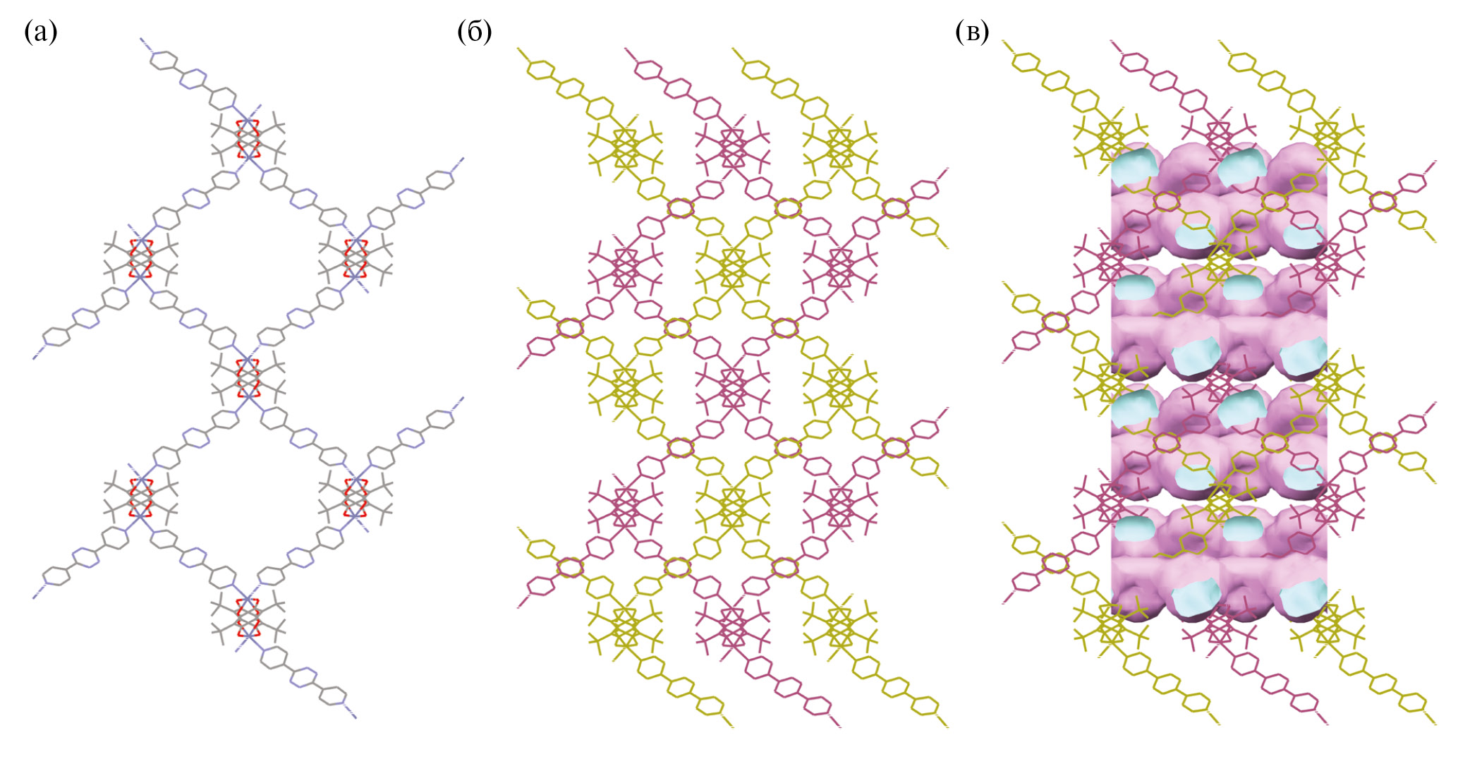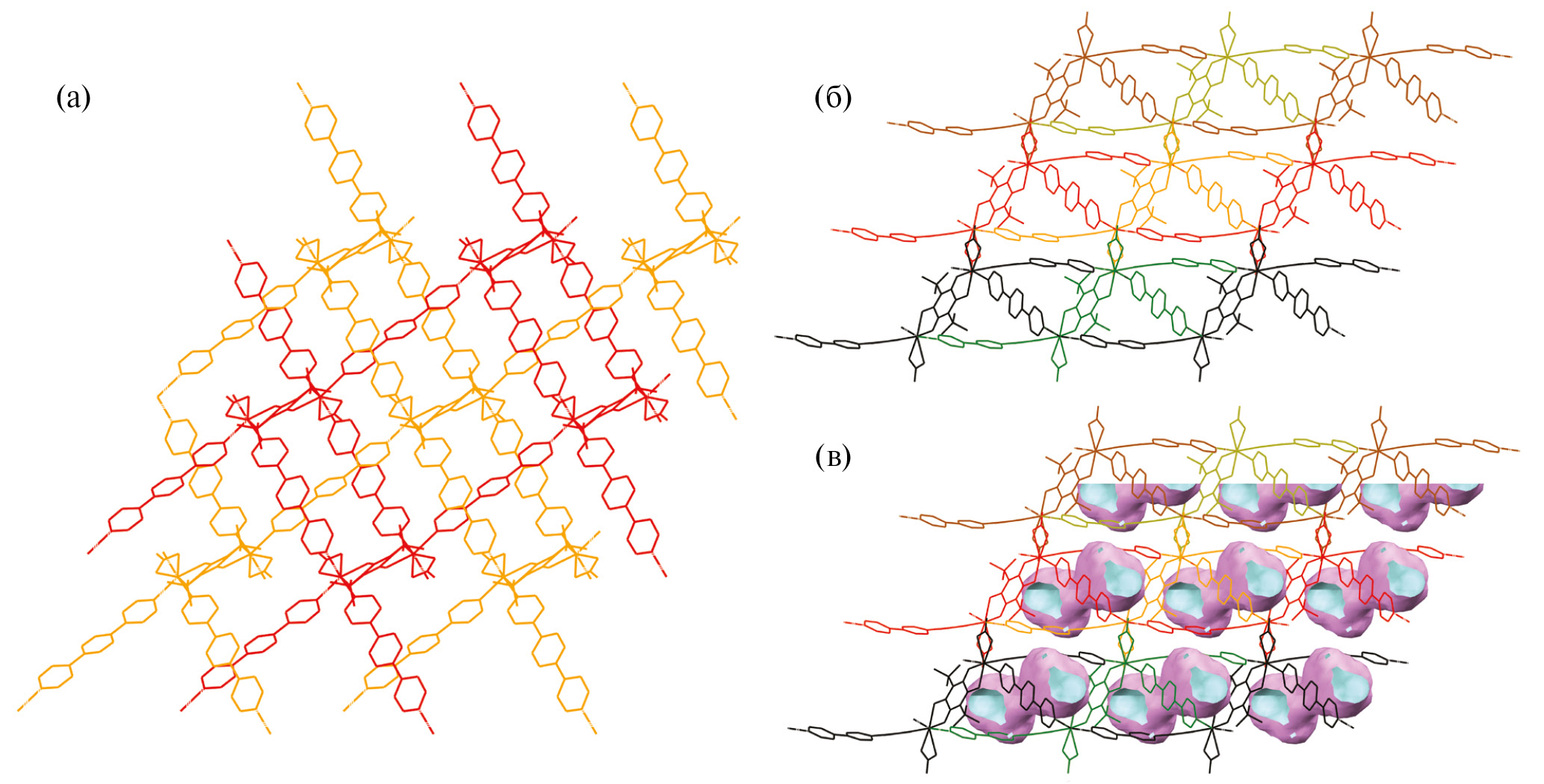 МОКП II представляет собой слои попарно взаимопроникающих сеток (рис. 4а), при этом вся совокупность переплетающихся сетей остается двухпериодической (рис. 4б). В МОКП II имеются изолированные поры, заполненные молекулами растворителя, объем которых составляет 20% от объема элементарной кристаллической ячейки. Объем пор рассчитан с радиусом зонда 1.2 Å и шагом 0.7 Å. Каналы заняты "гостевыми" молекулами DMF и MeOH в расчете на ион кадмия (рис. 4в).