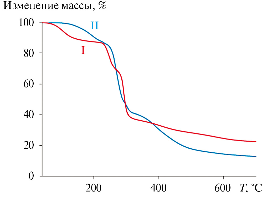 Термическая стабильность МОКП I и II была изучена методом термогравиметрического анализа. Кривые ТГА обоих образцов представлены на рис. 5. По данным рентгеноструктурного анализа, оба соединения содержат "гостевой" растворитель. Согласно результатам элементного анализа, данный растворитель остается в составе соединений при их высушивании на воздухе, что также подтверждено данными ТГА. Для МОКП I в температурном интервале 60–175°С потеря массы составляет 11%, что соответствует потере одной гостевой молекулы DMF (73.09 г/моль) в расчете на звено [Zn(pQ)(DPT)] · 2DMF (M = 698.09 г/моль). При дальнейшем нагревании в интервале температур 210–240°С наблюдается следующая ступень потери массы (Δm = 12%), отвечающая выходу оставшегося гостевого растворителя (1 молекула DMF) из каналов координационного полимера. Последующее повышение температуры приводит к химической деструкции соединения. Для МОКП II выход всех "гостевых" молекул растворителя — две метанола (M = 32.04 г/моль) и две DMF (M = 73.09 г/моль)), содержащихся в порах производного [Cd2(NO3)2(pQ)(DPT)3] · 2DMF · 2MeOH (М = 1518.10 г/моль), происходит в температурном интервале 90–240°С, потеря массы образца при этом составляет 14%. Дальнейшее повышение температуры приводит к разрушению полимера. Таким образом, оба координационных полимера обладают системой закрытых пор и каналов, что приводит к высокой температуре освобождения полостей каркасов от "гостевых" растворителей, которое достигается, согласно данным ТГА, только при температуре 240°С при атмосферном давлении.
