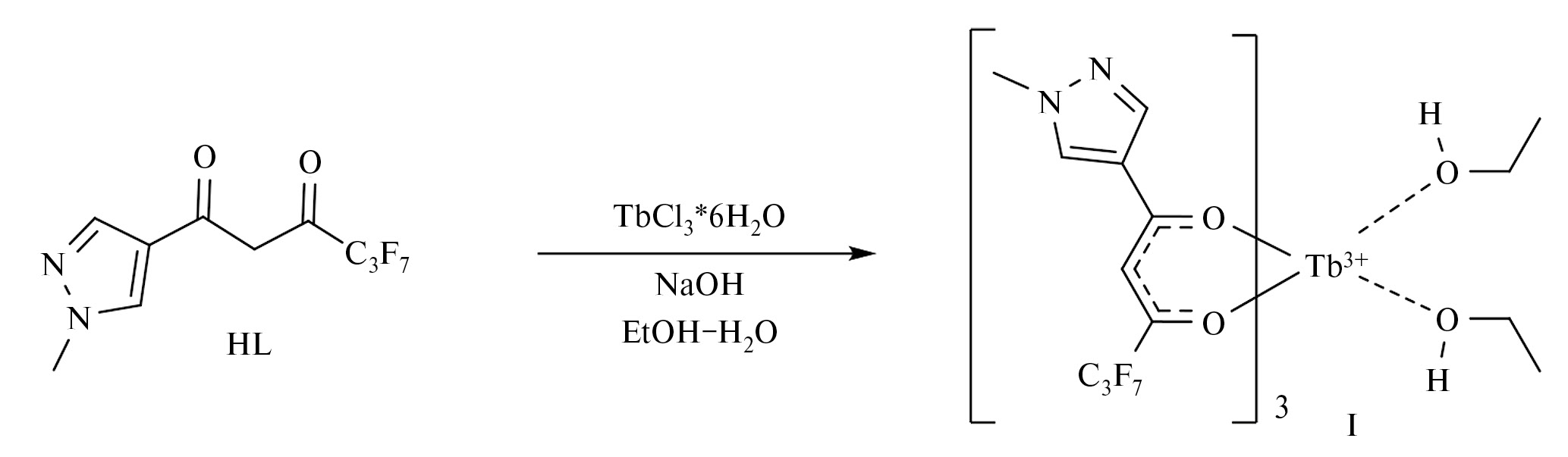 Ранее комплексы некоторых лантаноидов с подобными пиразольными лигандами, содержащими перфторированные заместители, были получены путем взаимодействия гидратированных гидроксидов Ln(OH)3 × xH2O(Ln = Sm3+, Eu3+) со спиртовыми растворами лигандов [26, 27] или путем взаимодействия солей лантаноидов (хлоридов или нитратов) со стехиометрически необходимым количеством лиганда и NaOH также в водно-спиртовой среде [28–30]. Реакция с гидроксидами лантаноидов возможна в виду достаточно высокой кислотности фторированных дикетонов [31], однако препаративно более сложна, чем одностадийный синтез. В данном случае удается провести взаимодействие соли металла и лиганда в одну стадию ввиду достаточно низкой растворимости образующегося комплекса I (схема 1).