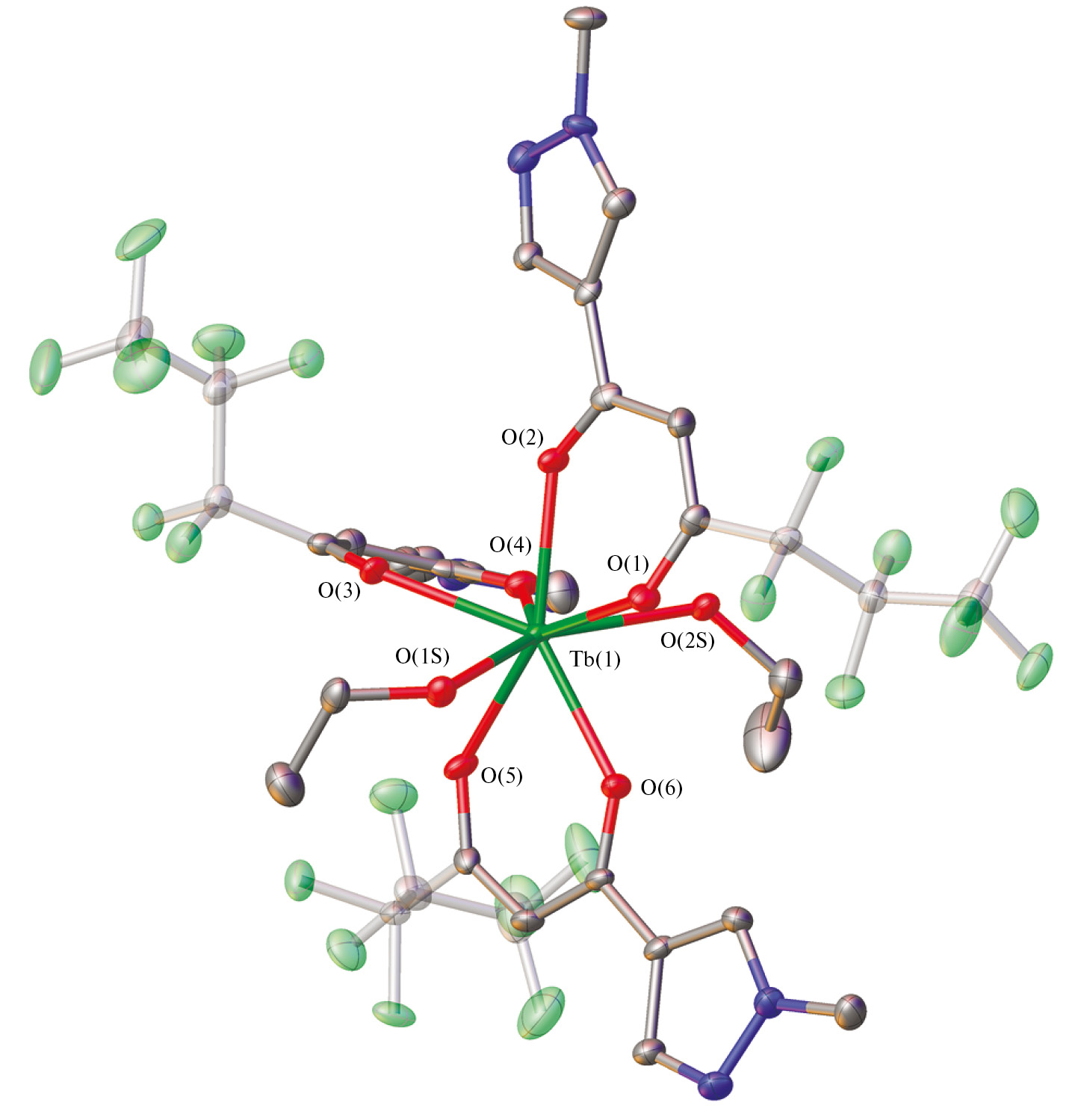 Рис. 1. Молекулярная структура соединения I. Эллипсоиды тепловых колебаний атомов приведены с 50%-ой вероятностью, атомы водорода не представлены. Перфторированные заместители ß-дикетонатного лиганда изображены полупрозрачными. Атомы тербия и его координационного окружения пронумерованы.