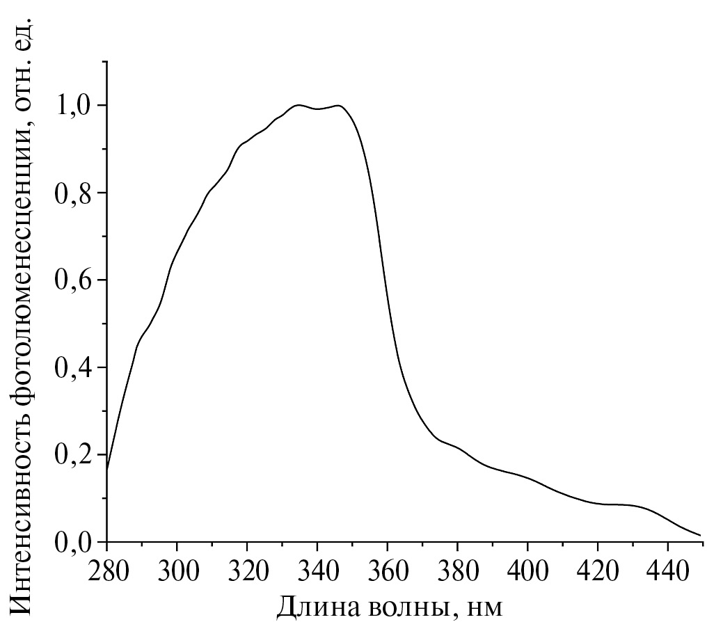 Спектр возбуждения ион-центрированной люминесценции комплекса I в кристаллической фазе при 300 K, при регистрации на длине волны 545 нм, представлен на рис. 4. В данном спектре выделяются две широкие полосы возбуждения в области 280–370 и 370–450 нм. Полоса в области 280–370 нм связана с возбуждением через электронные p–p*-переходы 1,3-дикетонного фрагмента. Присутствие полосы в области 370–450 нм может указывать на наличие дополнительного канала переноса энергии на ион либо посредством состояния с переносом заряда с лиганда на лиганд (LLCT), либо внутрилигандного переноса заряда (ILCT). Эту спектральную полосу нельзя отнести к состоянию с переносом заряда с лиганда на метал (LMCT), поскольку ион Tb3+ обладает слишком высоким потенциалом восстановления для фотовосстановления. В спектре отсутствуют характерные полосы, связанные с резонансным возбуждением центрального иона Tb3+, что свидетельствует об эффективной сенсибилизации через лигандное окружение.