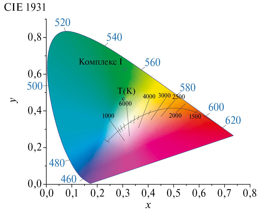 Рис. 6. Диаграмма цветности (цветовое пространство CIE 1931) для эмиссии комплекса I.