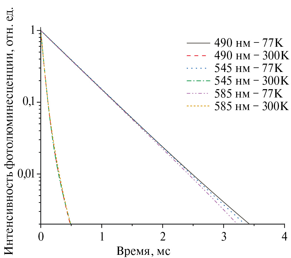 Спектры фосфоресценции в видимом спектральном диапазоне для координационных соединений иона Gd3+ регистрировали на том же спектрофлуориметре, используя импульсную ксеноновую лампу в качестве источника возбуждения. Твердые образцы помещали в кварцевые капилляры и охлаждались до 77 К в кварцевом криостате, наполненном жидким азотом. Кинетику люминесценции регистрировали на том же приборе, используя импульсную ксеноновую лампу с частотой повторения импульсов 100 Гц и длительностью импульса 50 мкс.