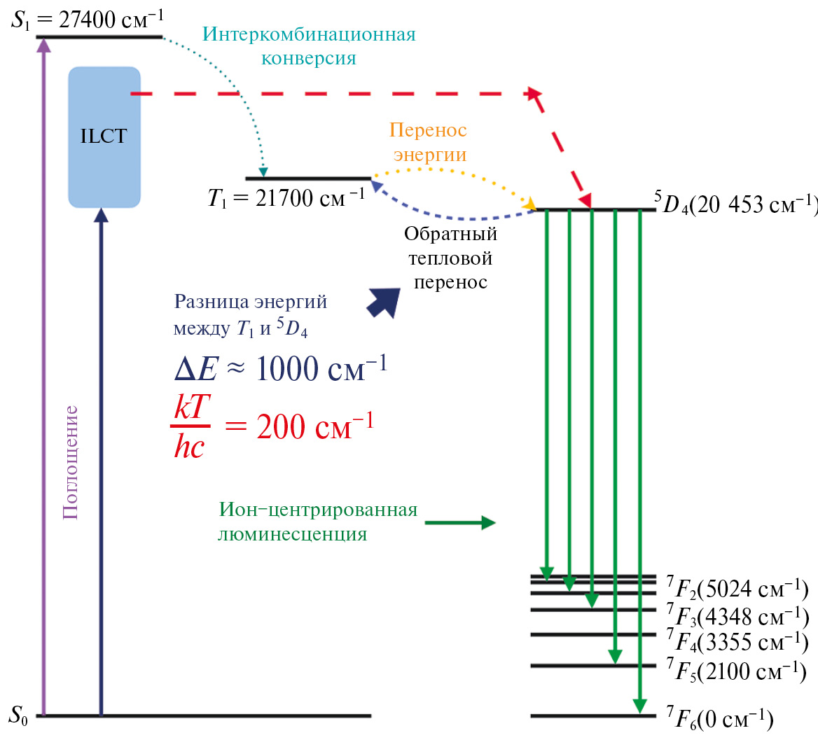 Увеличение в 10 раз времени затухания люминесценции при охлаждении до 77 K комплекса I связано с "вымораживанием" колебаний связей в молекуле и уменьшением константы скорости безызлучательной релаксации kтrad. Из энергетической диаграммы (рис. 9) следует, что ширина зазора между триплетным уровнем лиганда L и резонансным уровнем 5D4 иона Tb3+ составляет величину порядка 1000 см–¹, что соизмеримо с энергией тепловых колебаний решетки при 300 K. Это приводит к тому, что миграция энергии возбуждения "зацикливается" между этими двумя уровнями, и в конечном счете энергия релаксирует безызлучательно. В свою очередь, охлаждение комплекса I до 77 K приводит к уменьшению энергии колебаний решетки и, как следствие, к уменьшению вероятности обратного теплового переноса энергии электронного возбуждения.