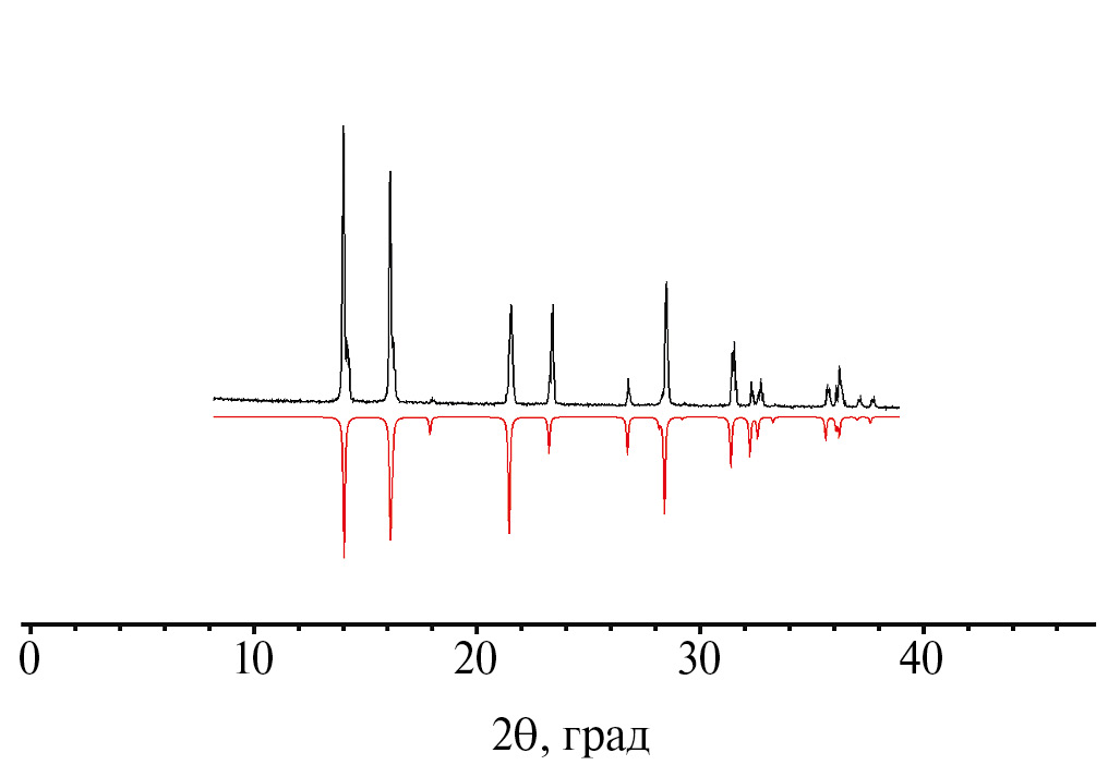 Рис. 2. Дифрактограмма для полученного порошкового образца [Re(CO)5I] (показана черным цветом) и теоретически рассчитанная (показана красным цветом) из данных РСА для монокристалла [Re(CO)5I].