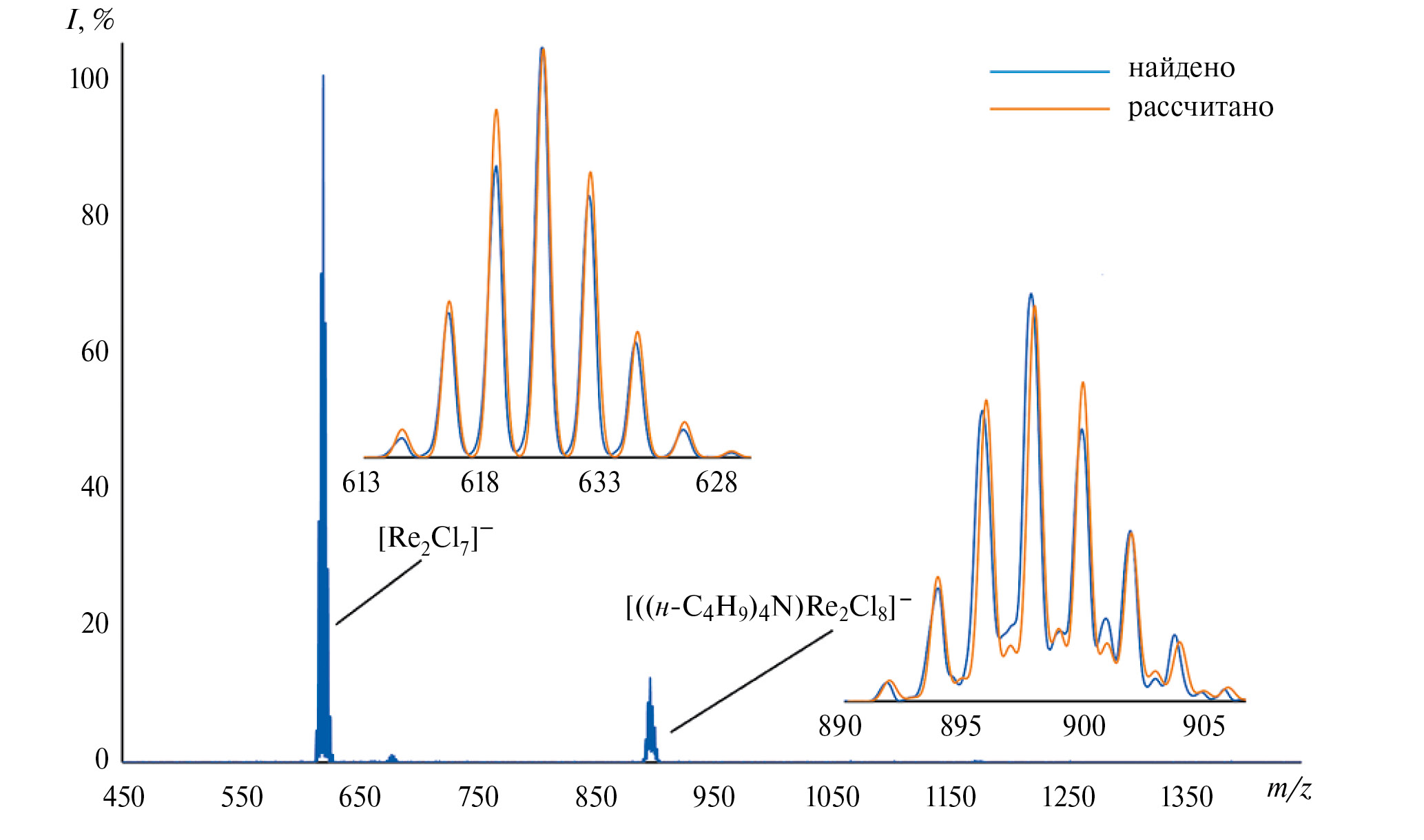 Целевое соединение ((н-C4H9)4N)2[Re2Cl8] выпадает в виде осадка при добавлении к раствору ((CH3)2NH2)2[Re2Cl8] в 6М HClр-р избытка (н-C4H9)4NBr; при этом [(CH3)2NH2]I и [(CH3)2NH2]Br остаются в растворе. Согласно данным энергодисперсионной рентгеновской спектроскопии для порошкового образца, в главном продукте реакции галогены Br и I отсутствуют, а соотношение элементов Re : Cl соответствует теоретическому 1 : 4. Элементный анализ на C, H, N соответствует теоретически рассчитанному содержанию указанных элементов в твердом образце для ((н-C4H9)4N)2[Re2Cl8]. Электронный спектр поглощения ацетонитрильного раствора ((н-C4H9)4N)2[Re2Cl8] идентичен и свидетельствует о наличии в растворе сольватированных кластерных анионов [Re2Cl8]2– c характерными для данных частиц полосами поглощения 310 нм (интенсивный) и 680 нм (уширенный). ESI-MS спектр ((н-C4H9)4N)2[Re2Cl8] в CH3CN подтверждает чистоту полученного соединения соответствием найденных и рассчитанных изотопных распределений для частиц [Re2Cl7]– и ({(н-C4H9)4N[Re2Cl8]}– (рис. 3) при отсутствии каких-либо значимых примесных сигналов в спектре.