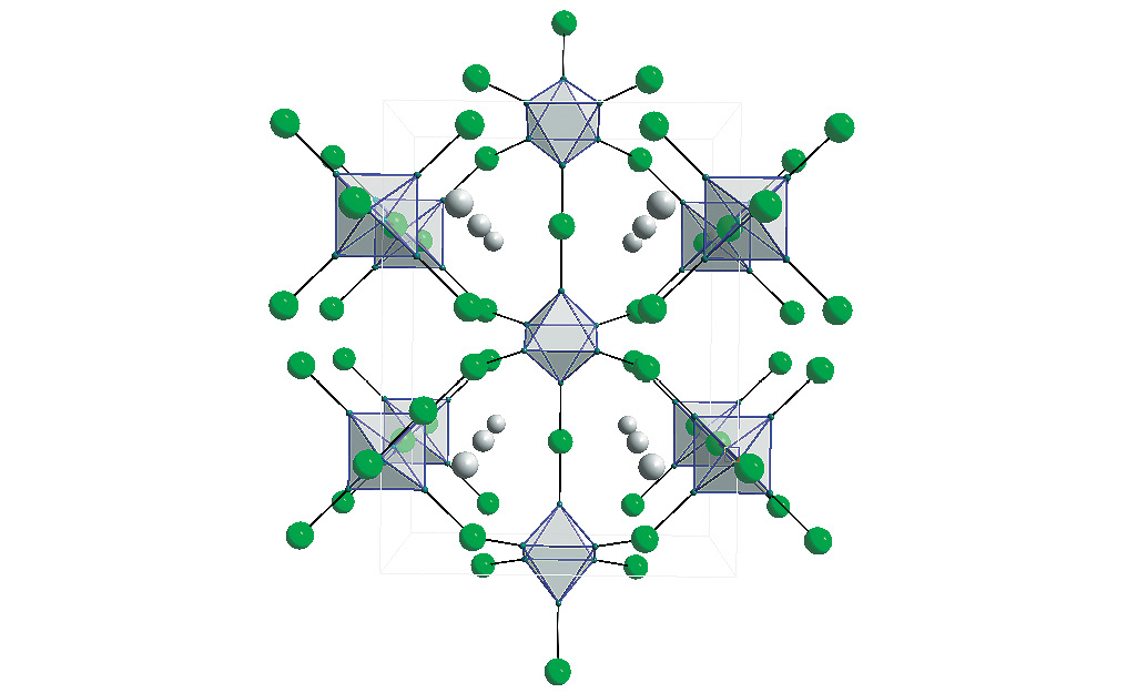 Рис. 2. Фронтальная проекция структуры In[Nb6Cl15]: в виде октаэдров представлены кластерные ядра Nb6, связанные мостиковыми атомами Cl; одиночные атомы — In+ [14]