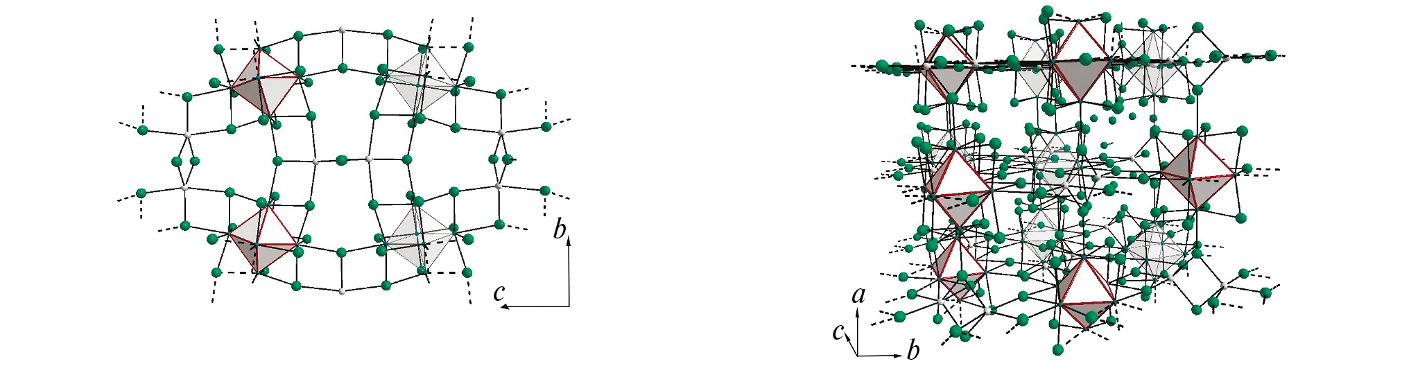Рис. 3. Структура Li2[Nb6Cl16]: показаны слой (слева) и трехмерный каркас с участием ионов лития (серые шарики, справа)