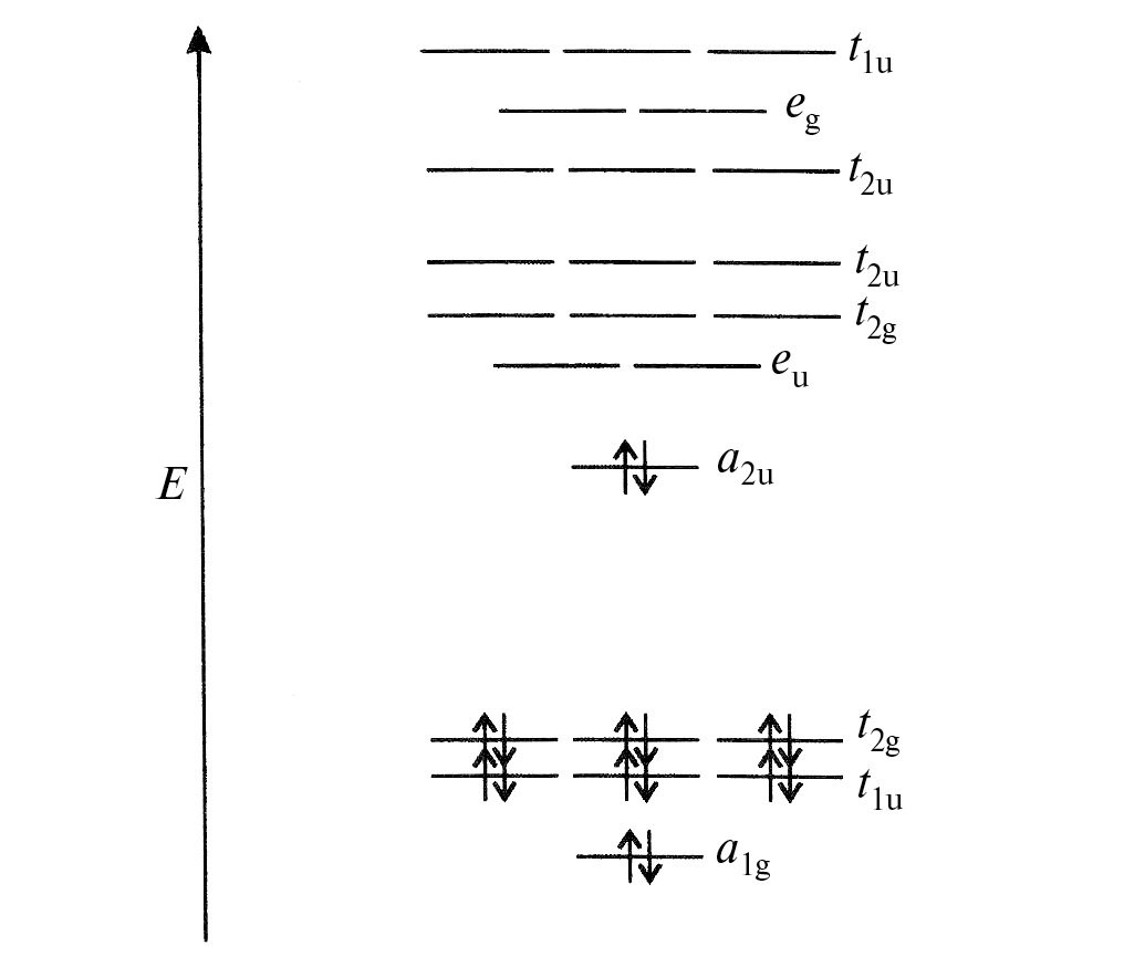 Поскольку и галогенид- и халькогенид-ионы не являются p-акцепторными лигандами сильного поля, правило 18 электронов и связанные с ним правила Уэйда–Мингоса не применимы для определения «магического числа» электронов, необходимых для стабильности кластера. Для существования устойчивых кластеров [M6Xi12Ya6]n достаточно уже 14 кластерных скелетных электронов с возможностью дополнительного обратимого восстановления в 15- и 16-электронные кластеры. Этим числам отвечают кластерные ядра {M6Xi12}4+, {M6Xi12}3+ и {M6Xi12}2+ соответственно. Такая «электронная емкость», подразумевающая возможность сохранения структуры при потере или присоединении нескольких электронов за счет небольшого изменения геометрических параметров, позволяет рассматривать октаэдрические кластеры как «электронные резервуары». Начиная с 1960-х гг. проводились экспериментальные исследования (ЭПР, электронные спектры поглощения, магнитные измерения) и квантово-химические расчеты электронной структуры кластеров с ядром {M6(µ2-X)12}n+ [37–40]. Было показано, что граничные орбитали (ВЗМО и НВМО) являются металл-центрированными, и их заполнение влияет на связывание металл-металл в кластере. Кластеры {M6X12}4+ (14 кластерных скелетных электронов) и {M6X12}2+ (16 кластерных скелетных электронов) диамагнитны. Почти чисто спиновые магнитные моменты для 15-электронного (M6X12)3+ свидетельствует о том, что при восстановлении {M6X12}4+ электроны занимают невырожденную молекулярную орбиталь a2u (рис. 5). Связывающий характер a2u-орбитали подтверждается заметным удлинением расстояния М–М (около 0,1 Å) при удалении с нее электронов.