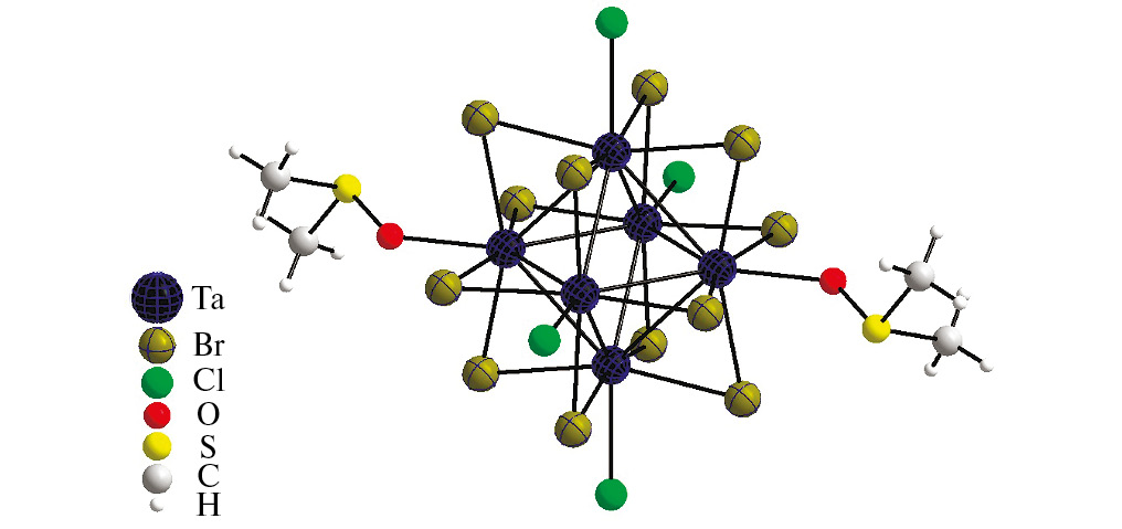 Из аквакомплекса [(Ta6Br12)Br2(H2O)4] · 4H2O и диметилсульфоксида в HCl был получен нейтральный комплекс [(Ta6Br12)(Dmso)2Cl4] [57] (рис. 8).