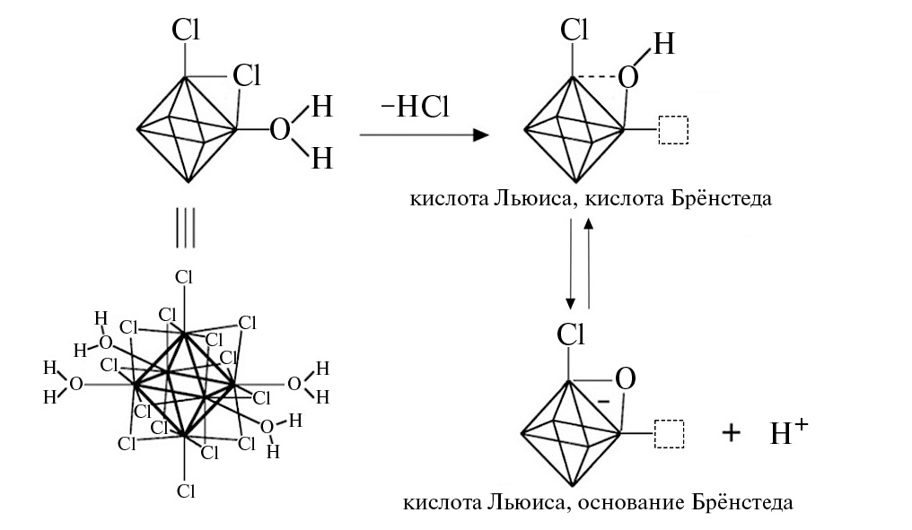 При дегидратации на начальном этапе происходит замещение одного из мостиковых хлоридных лигандов на OH– c отщеплением HCl, и возникают два типа активных центров: кислотно-основные центры Бренстеда и координационно-ненасыщенный центр при атоме металла за счет удаления молекулы воды (схема 1). Мостиковый гидроксид за счет повышенной кислотности представляет собой сильную кислоту Бренстеда, в то время как сопряженное основание — мостиковый оксидный лиганд — может выступать в качестве основного катализатора [89]. Такие катализаторы эффективны в разнообразных реакциях, таких как дегидрирование спиртов, изомеризация, алкилирование и ацилирование тиолов, циклизации, пиролиз и др. [90–94].