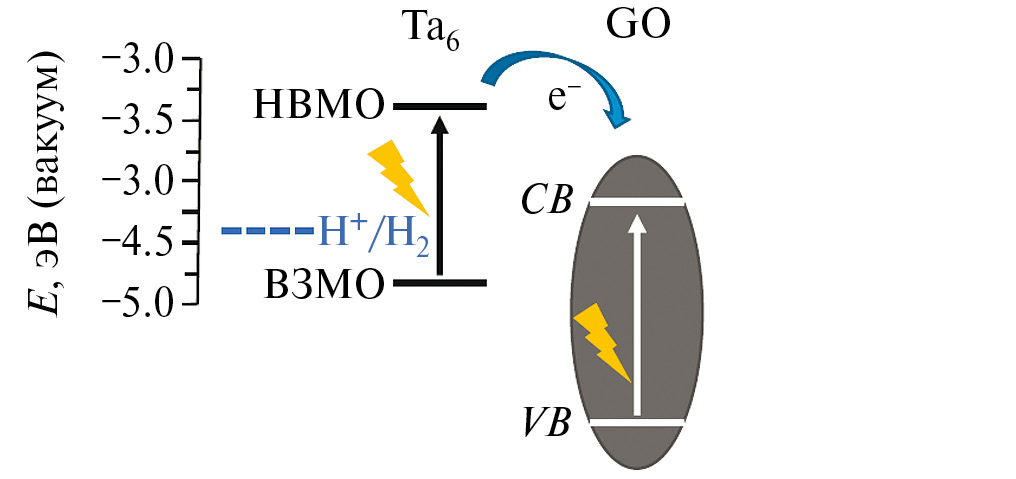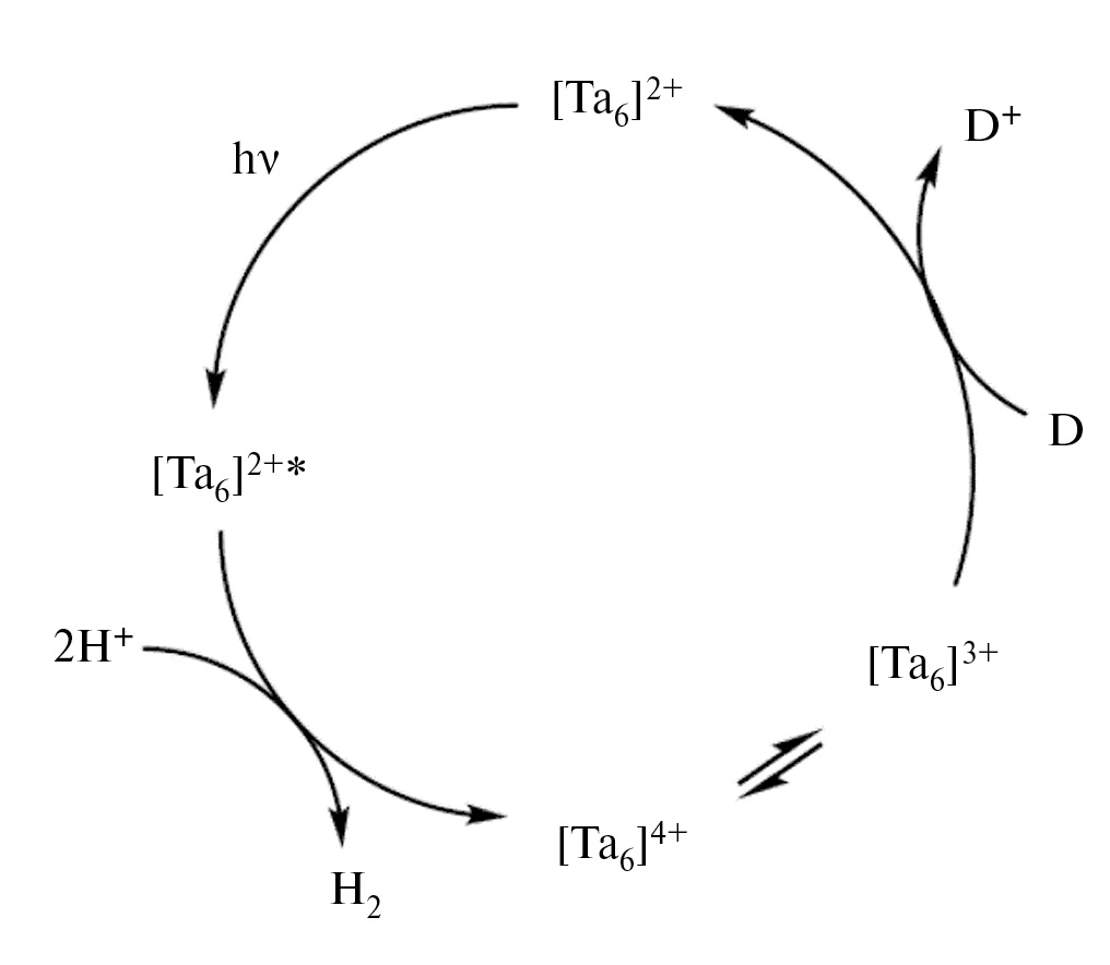 Облучение {Ta6Br12}2+ в деаэрированном солянокислом растворе приводит к фотохимическому окислению кластерного ядра до состояния {Ta6Br12}4+ и образованию Н2. Предполагается, что ключевой этап включает в себя двухэлектронный перенос с ядра {Ta6Br12}2+ к молекуле воды, образование {Ta6Br12}4+ и координированного гидрид-иона H– с последующим взаимодействием гидрид ионов с H+ с образованием H2 [85].