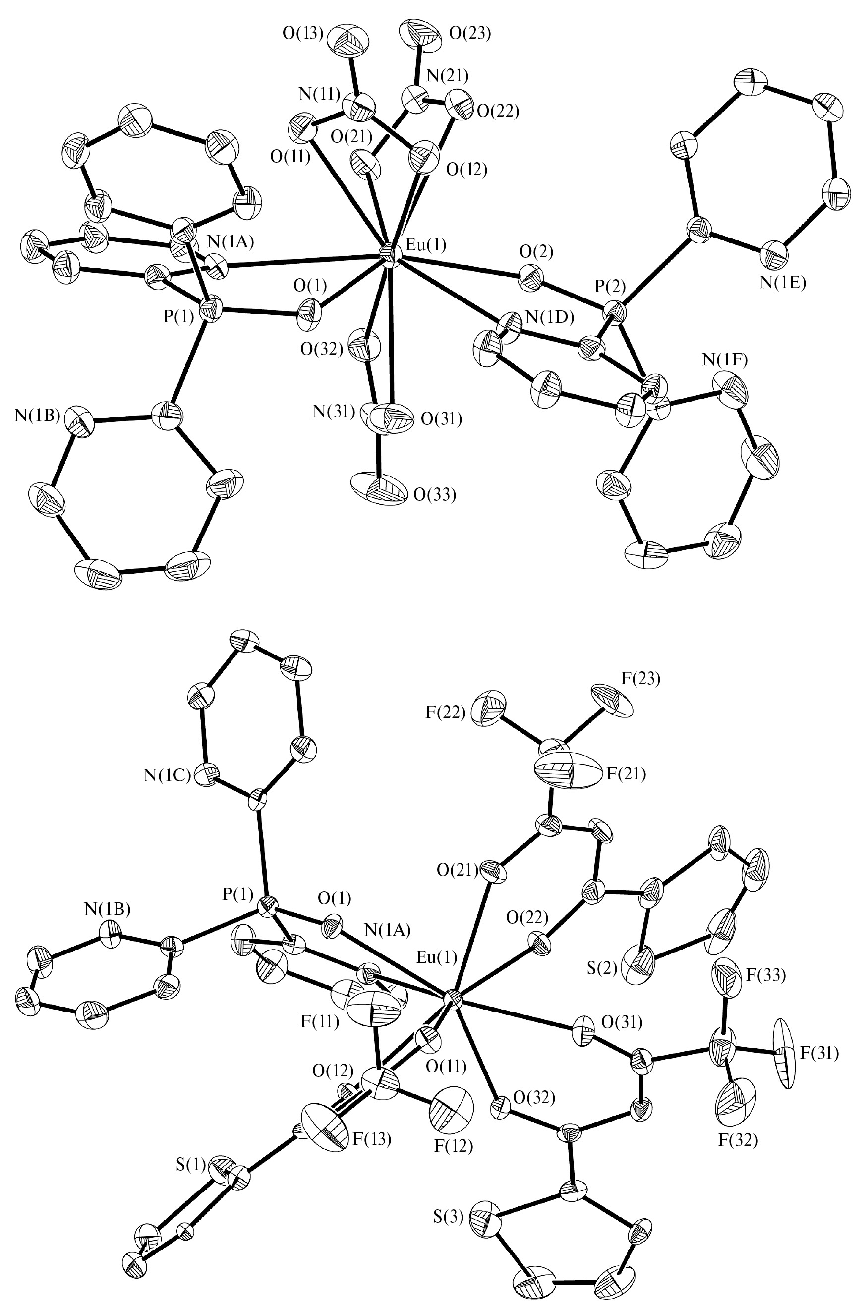 Синтез [Ln(Py3PO)(TTA)3] (Ln = Eu (VI), Tb (VII)). К раствору Py3PO (0.05 ммоля, 0.014 г) в 4 мл MeCN при перемешивании добавляли раствор [Ln(TTA)3(H2O)2] (0.05 ммоля, 0.043 г) в 3 мл MeCN. Медленное испарение полученного раствора при 6°С в течение 2 сут привело к образованию осадка в виде желтоватых кристаллов. Кристаллы отфильтровывали, промывали с помощью MeCN (2 раза по 3 мл) и сушили в эксикаторе над безводным перхлоратом магния при комнатной температуре. Выход 0.027 г (49%) и 0.029 г (52%) для комплексов VI и VII соответственно.