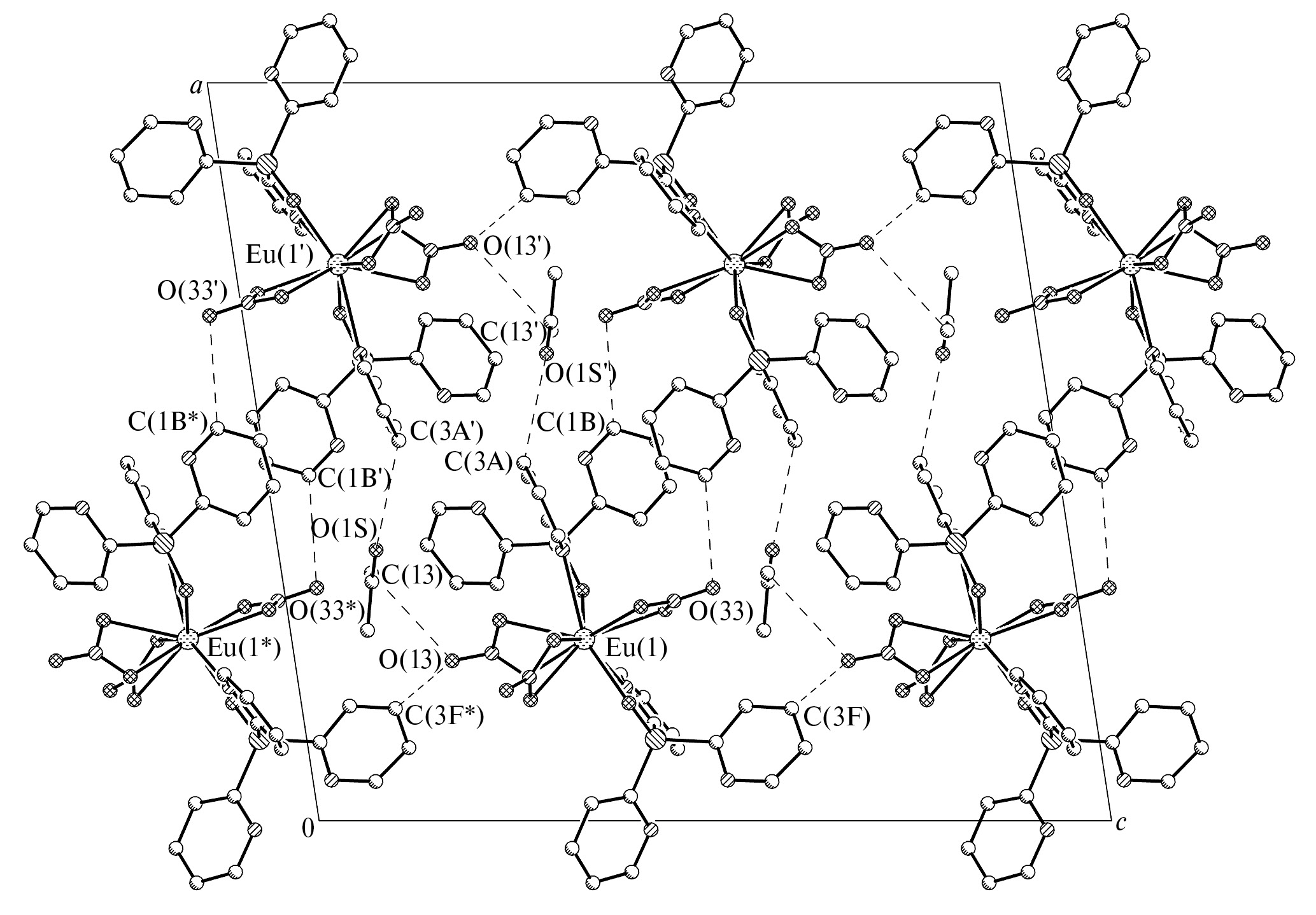 В кристаллической структуре II между соседними молекулами комплекса имеются короткие контакты С−Н…О (3.167 Å) в плоскости ас (рис. 3). Молекулы Me2CO также образуют слабые взаимодействия С−Н…О с молекулами комплекса. Расстояние между ближайшими атомами Eu составляет 8.424 Å.