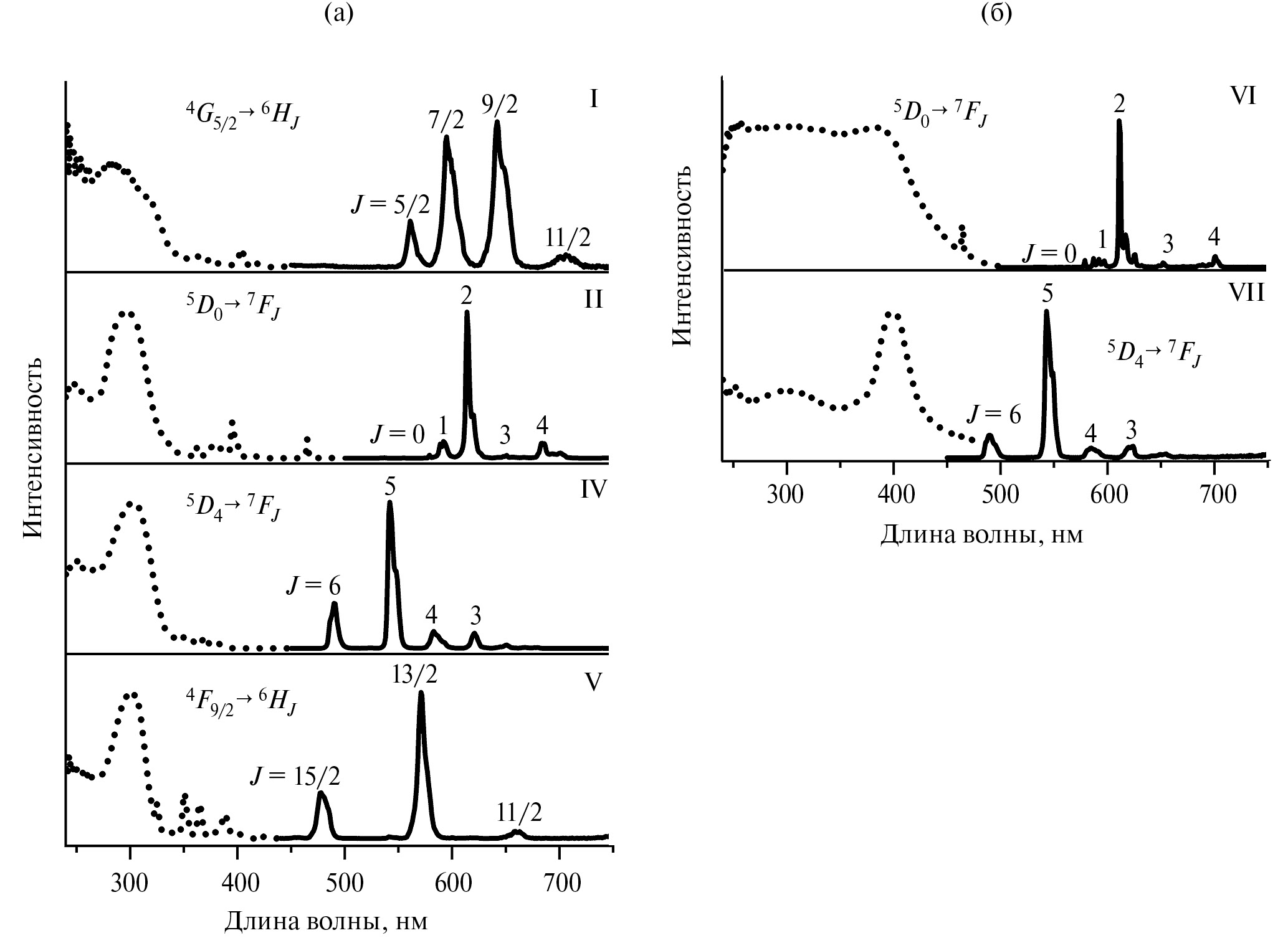 Рис. 5. Нормированные спектры возбуждения ФЛ (пунктирная линия) и эмиссии (непрерывная линия) комплексов I, II, IV, V (а) и VI, VII (б) в твердой фазе при 300 K c обозначением f‒f-переходов в ионах Ln3+