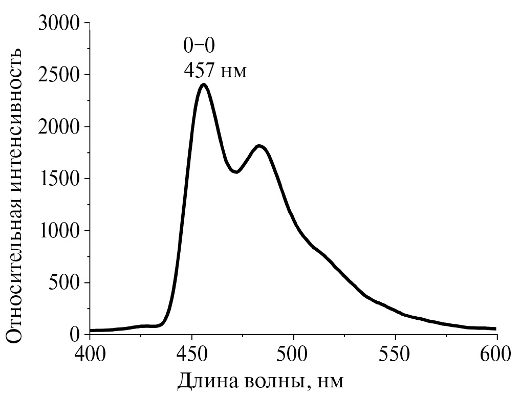 Комплекс иона Gd3+ III проявляет лиганд-центрированную ФЛ. Его спектр эмиссии в твердой фазе при 77 K содержит широкую полосу в области 435‒600 нм с хорошо разрешенной колебательной структурой (рис. 6). Времена релаксации возбужденного триплетного состояния для всех трех компонент с максимумами при 457, 485 и 520 нм близки и составляют 8.2, 8.4 и 8.1 мс соответственно. Энергия уровня Т1, равная 21900 см‒1, была определена по максиму коротковолновой полосы (457 нм) в спектре фосфоресценции III.