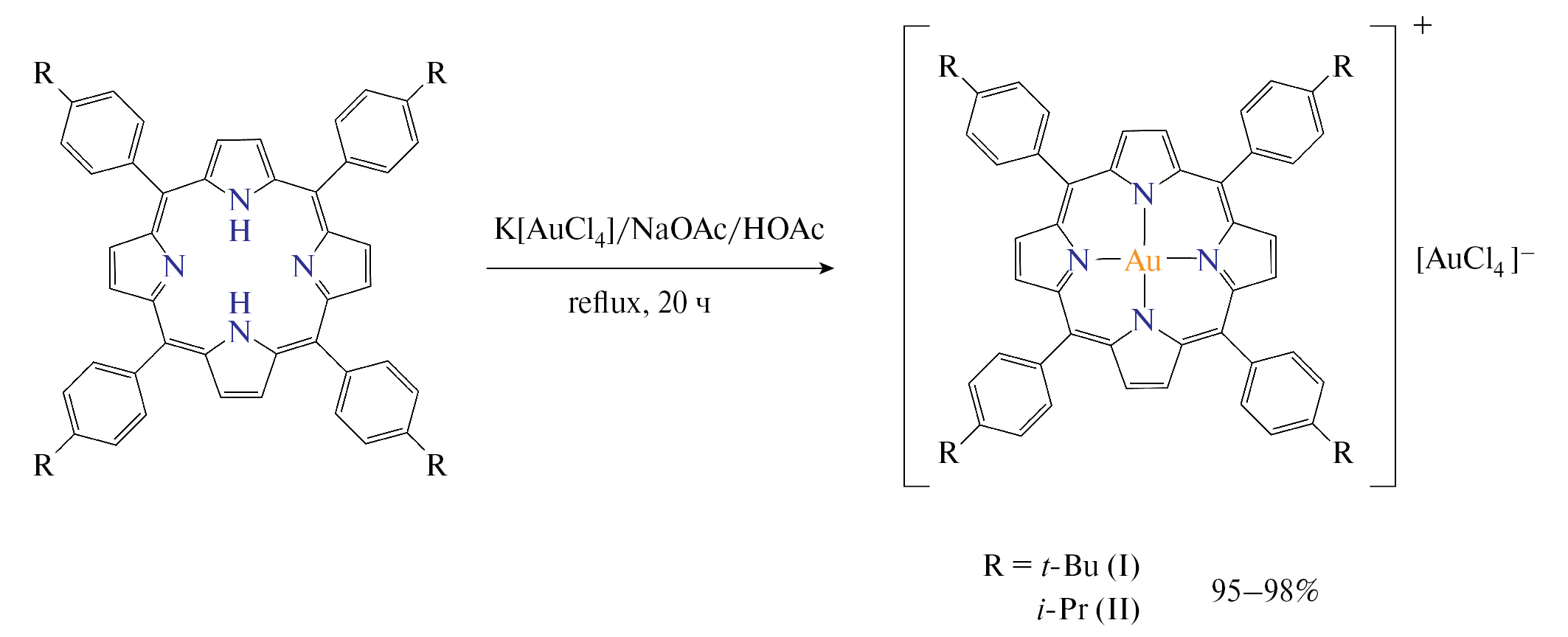 Исходные соединения K[AuCl4], тетракис-(4-изопропилфенил)порфирин (H2TIPPP) и тетракис-(4-трет-бутилфенил)порфирин (H2TTBPP) были синтезированы по соответствующим методикам [22, 23]. Растворители очищали по стандартным методикам [24].