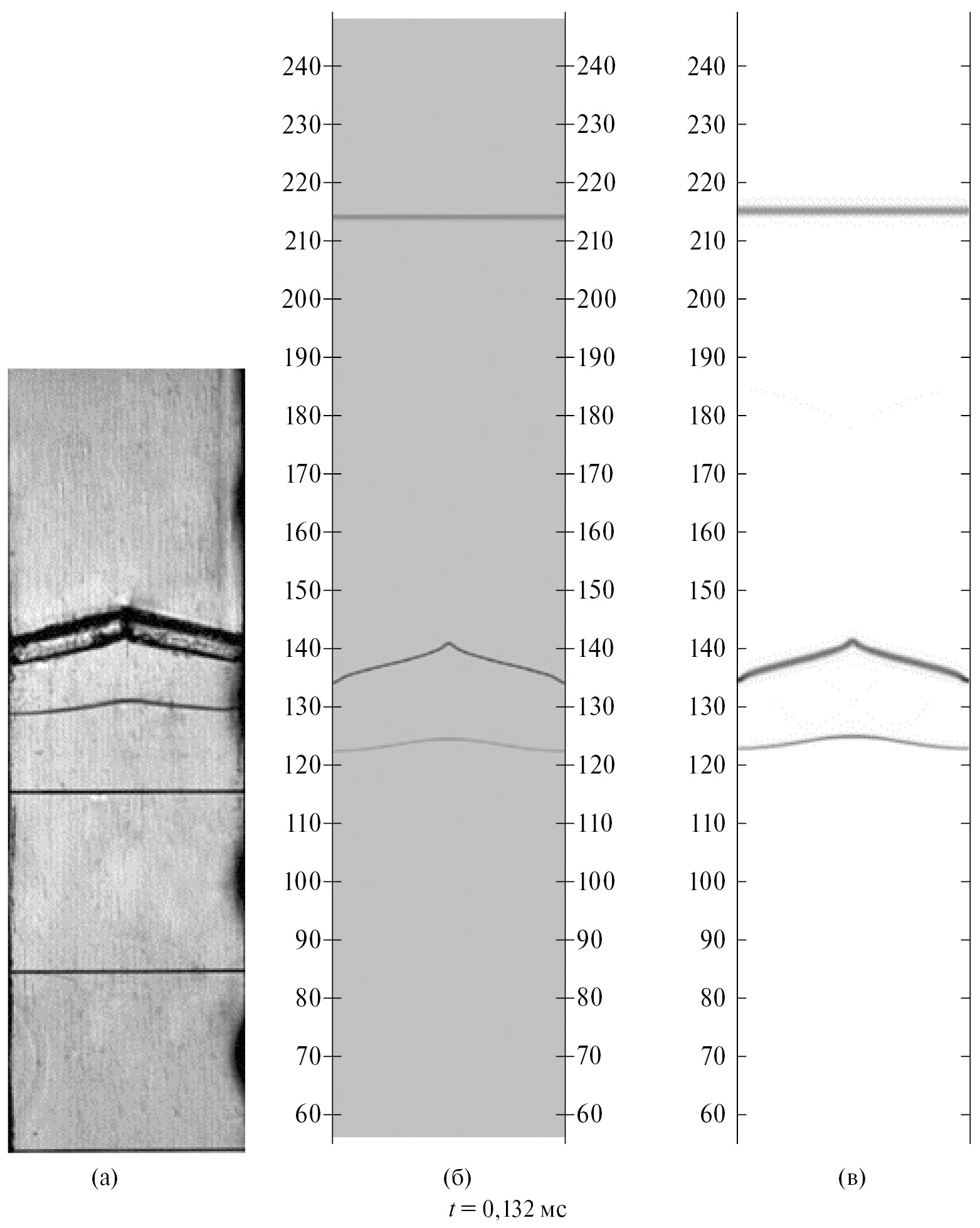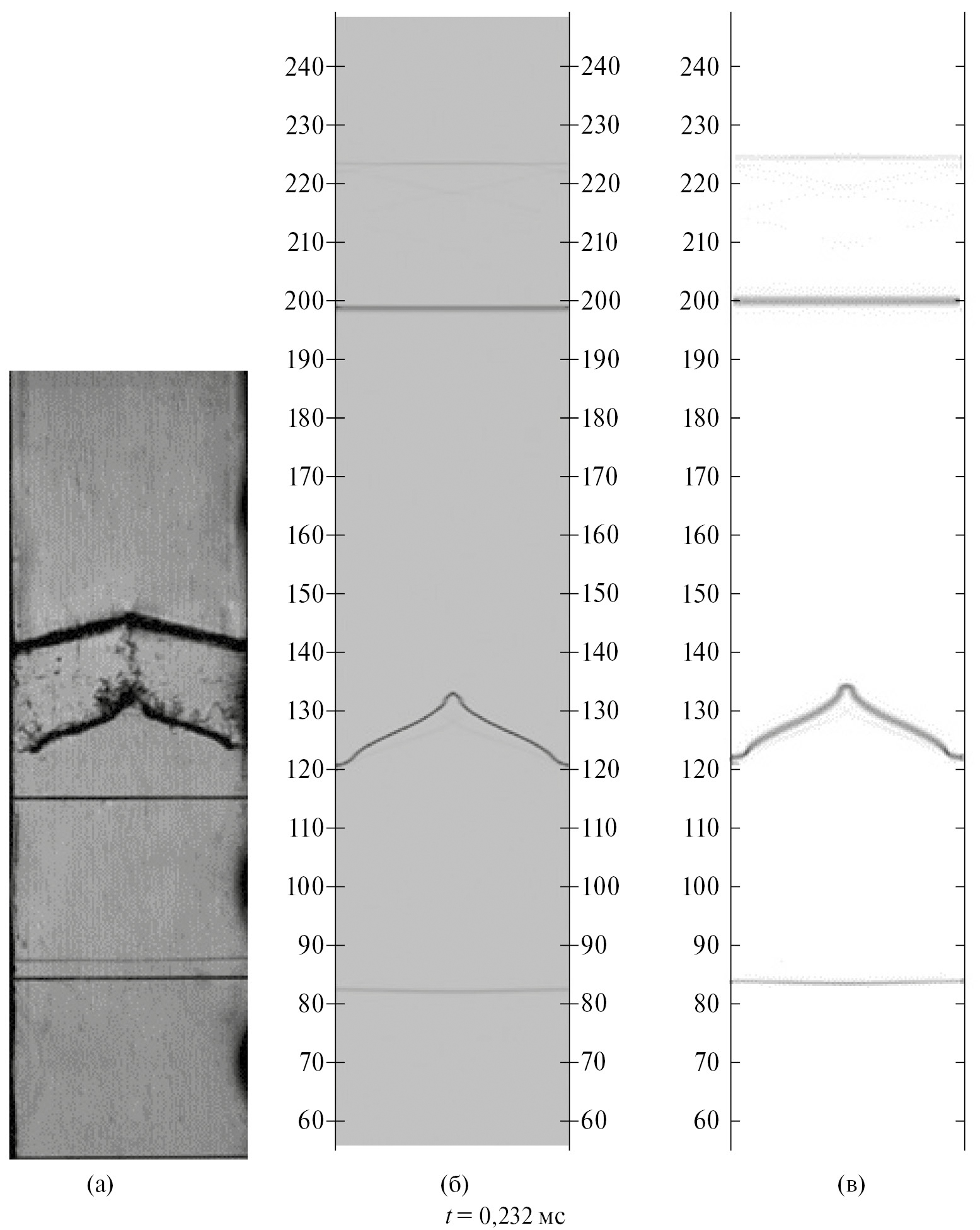 Однако имеются и более существенные отличия расчетов от экспериментов. Во всех расчетах есть небольшое отставание ударной волны, приходящей на место расположения проволочной сетки (рис. 7), по сравнению с экспериментальными данными, на рис. 9 видно, что расчетная ударная волна опережает экспериментальную. Наиболее согласующиеся с экспериментом данные получены в расчете 2 с учетом фрагментов пленки. В частности, на рис. 9 в расчете 2 отраженная от пленки волна (которая распространяется вверх по трубе) заметно ближе к экспериментальному положению. Еще более заметно, что в расчете 2 ЗТП на границе воздух–SF6 согласуется с экспериментальными данными, в то время как в расчете 1 она практически отсутствует, а имеются лишь завитушки вследствие проявления сдвиговой неустойчивости, а в расчете 3 ЗТП имеется, однако она значительно тоньше. Таким образом, пленка играет важную роль в данном течении и для корректного численного моделирования необходимо ее учитывать.