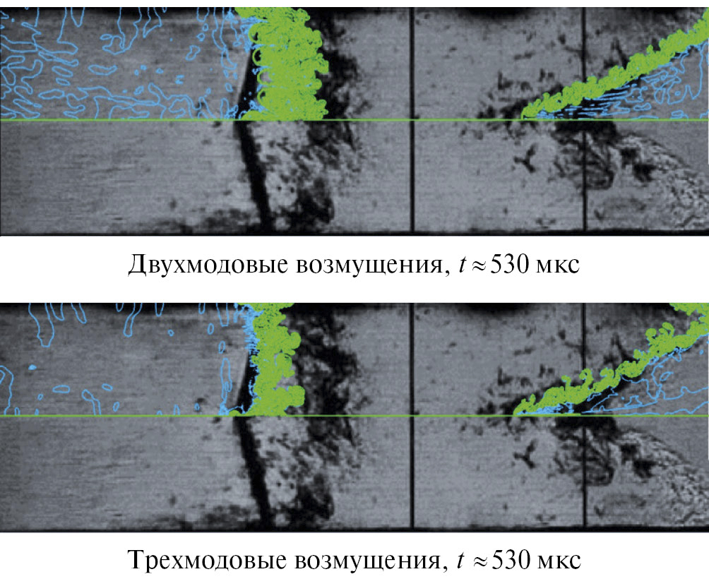 На начальном этапе имеющиеся на контактной границе веществ малые возмущения под действием неустойчивостей начинают расти и довольно быстро выходят на насыщение и нелинейную стадию, на которой происходит взаимодействие и разрушение различных мод и формирование зоны турбулентного перемешивания. Законы развития этой зоны перемешивания, а также варианты ее взаимодействия с классическими сильными и слабыми разрывами представляют существенный интерес [6–8]. На протяжении десятилетий одним из основных вопросов остается вопрос о влиянии начальных (случайных или детерминированных) возмущений на переход к развитому перемешиванию.