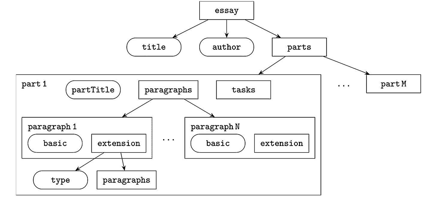 Расширяемое эссе представляется в виде JavaScript-объекта следующей структуры (рис. 3): на самом верхнем уровне располагаются поля title и author, хранящие название эссе и автора. Содержание самого эссе представляется в виде массива разделов parts, каждый раздел является JavaScript-объектом со следующими полями: partTitle — название раздела, paragraphs — массив абзацев и tasks — контрольные вопросы. Каждый абзац в свою очередь также представляется объектом со следующей структурой: basic — базовое содержание абзаца в формате HTML, extension — расширение к абзацу. Если для абзаца расширения нет, то поле extension имеет значение null, в противном случае, extension представляет собой JavaScript-объект с атрибутами type (тип расширения) и paragraphs — массив абзацев расширения.