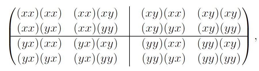 - Неассоциативные мономы , длины 3. Две таблицы n3 коэффициентов записываются ((k – 1)-е число Каталана) кубами n × n × n коэффициентов.