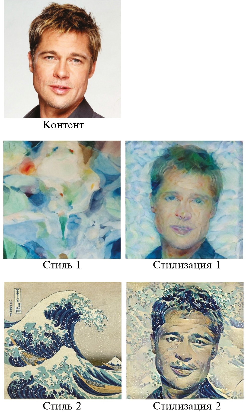 Изначально указанная задача была известна под названием non-photorealistic rendering [1–3] и решалась эвристическими методами обработки изображений, подбираемыми под каждый стиль. Нейросетевой перенос стиля, предложенный в работе [4], позволил переносить стиль с произвольного стилевого изображения-образца, как показано на примере стилизации контентного изображения двумя стилями на рис. 1.