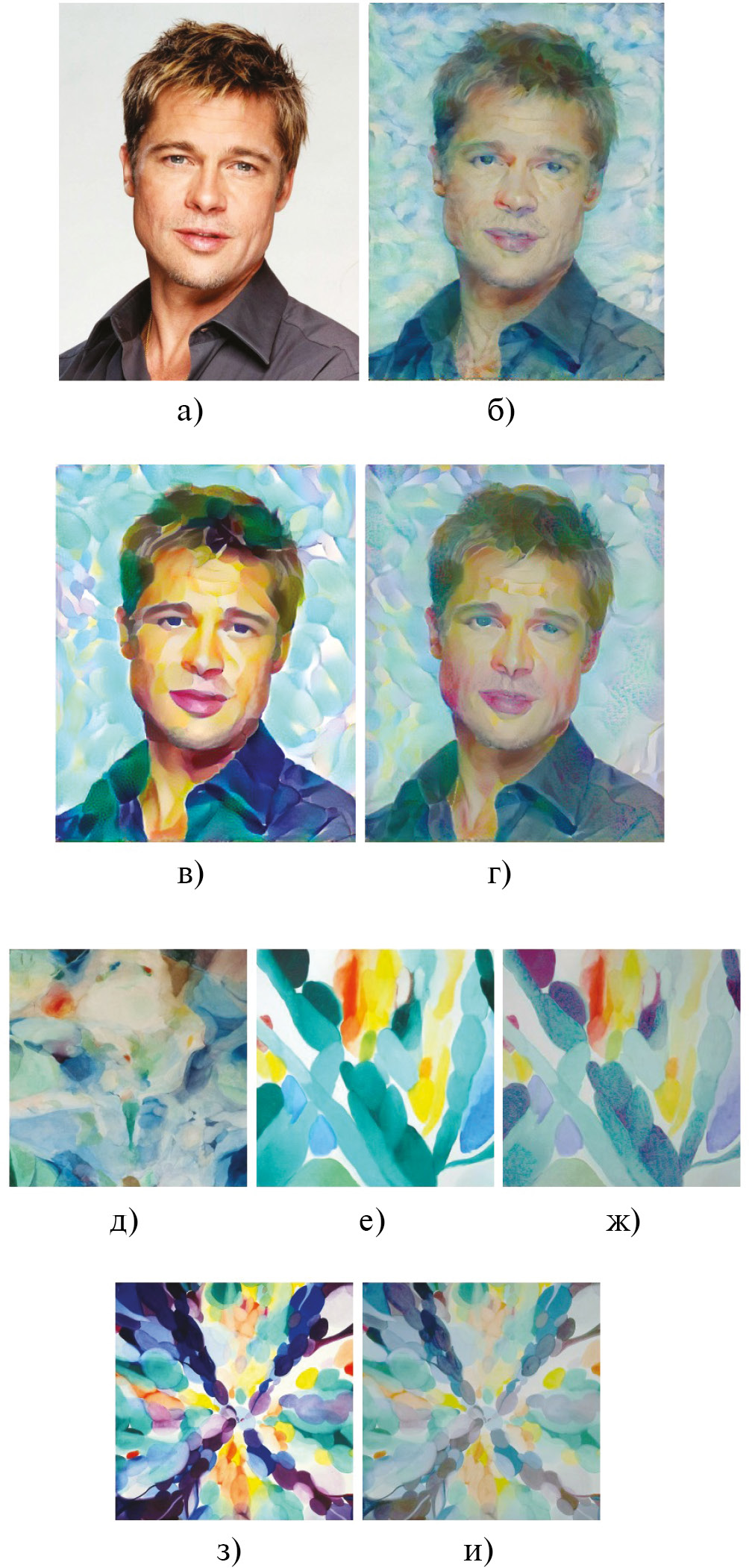 Рис. 3. Пример работы алгоритма стилизации по группе найденных стилей с перекрашиванием исходного стиля: a) контент; б) стандартная стилизация контента a) по стилю д); в) предложенная стилизация по группе найденных стилей е) и з); г) предложенная стилизация по группе стилей с перекрашиванием ж) и и); д) исходный стиль; е) 1-й найденный стиль; ж) стиль е) перекрашенный в д); з) 2-й найденный стиль; и) стиль з) перекрашенный в д)