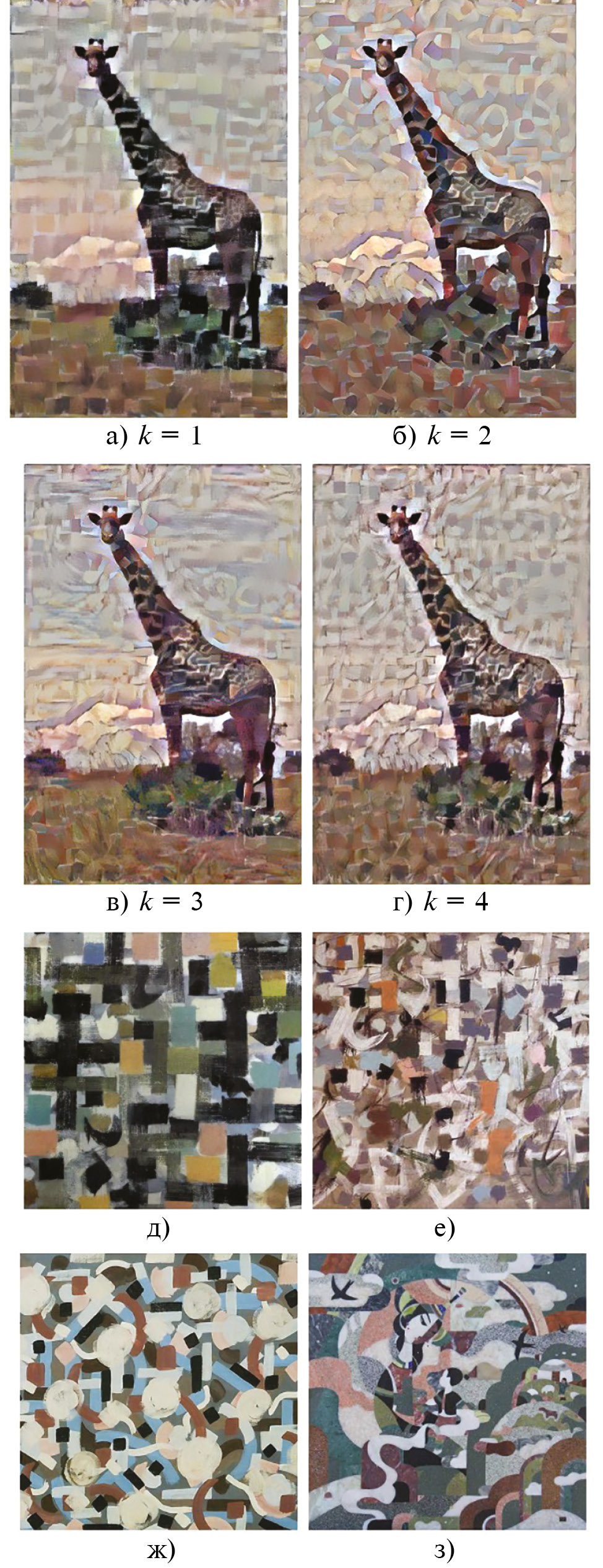 Рис. 5. Работа предложенным алгоритмом стилизации по группе найденных стилей при различном размере группы k: a) стилизация по д), k = 1; б) стилизация по д) и е), k = 2; в) стилизация по д) – ж), k = 3; г) стилизация по д) – з), k = 4