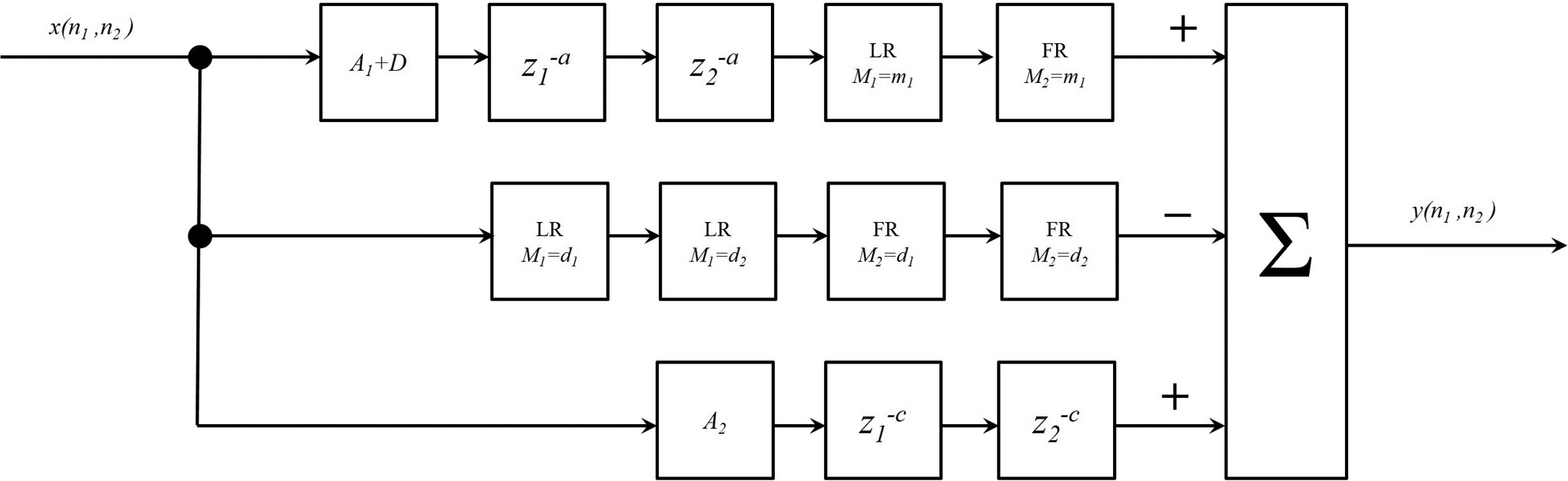 Данная структурная схема состоит из трех ветвей. В первой ветви фильтра формируется маска размером m1 × m1 элемента, которая необходима для создания области положительных элементов (при наличии окаймления в виде отрицательных элементов) внутри основной маски, это осуществляется для нормализации яркости обработанного изображения. Вторая ветвь фильтра формирует основную маску фильтра размерностью d1 × d2 элементов, которая подается на сумматор с отрицательным знаком. Третья ветвь используется для добавления к итоговой апертуре дополнительного коэффициента фильтрации (A2). Далее происходит суммирование полученных масок первой и второй ветвей фильтра, и за счет полученной отрицательной основной маски происходит вычитание первой положительной маски, в результате чего на выходе получается итоговая маска фильтра размерностью d1 × d2 элементов, эквивалентная обработанному изображению.
