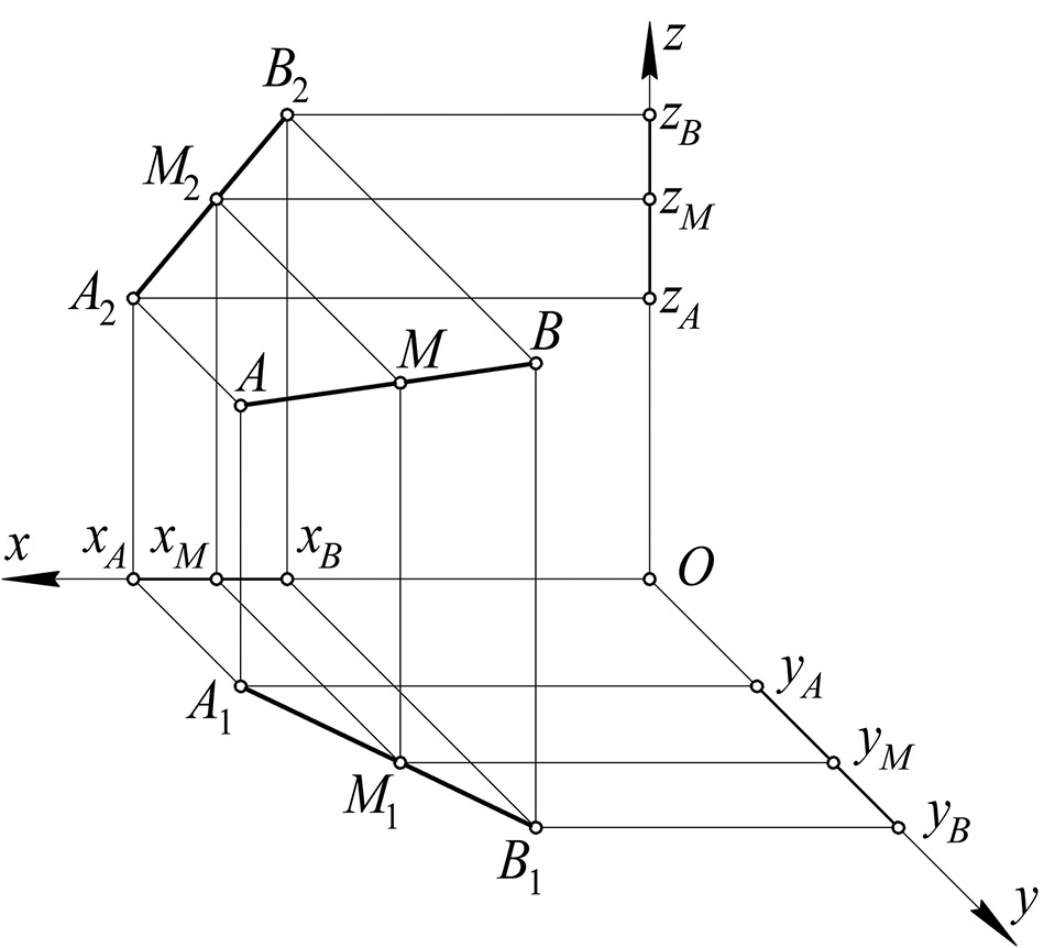 В качестве математического аппарата, способного обеспечить эффективную реализацию геометрического ядра САПР нового поколения, предлагается использовать точечное исчисление [21] исходя из следующих соображений. Базовым методом точечного исчисления является метод проецирования геометрического объекта на оси глобальной системы координат, в отличие от начертательной геометрии, в основу которой положен метод проецирования пространственных геометрических объектов на плоскости проекций. Такой подход позволяет переходить от символьных точечных уравнений к системе однотипных параметрических уравнений. Геометрическая интерпретация такого перехода представляет собой параллельное проецирование пространственного геометрического объекта на оси глобальной системы координат. Аналитически этот процесс описывается систематической заменой точек на соответствующие их координаты. Эта операция получила название покоординатного расчета. Вместе с тем покоординатный расчет целесообразно выполнять тогда, когда получено итоговое точечное уравнение моделируемого геометрического объекта, что значительно сокращает время необходимых вычислений. Геометрическое моделирование в точечном исчислении осуществляется на основе геометрической схемы – графического алгоритма построения геометрического объекта с последующим описанием в виде точечных уравнений и вычислительных алгоритмов на их основе. При этом каждой графической операции ставится в соответствие аналитическая операция. Это привело к разработке инструментов геометрического моделирования, инвариантных относительно параллельного проецирования, которые способны обеспечить покоординатный расчет точечных уравнений [22]. Например, определение отрезка прямой в 3-мерном пространстве благодаря инвариантным свойствам параметра точечного исчисления, которым является простое отношение трех точек прямой (рис. 1), выглядит следующим образом: