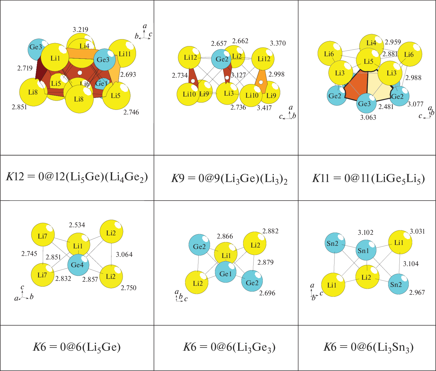 Самоорганизация интерметаллических систем: новые кластерные прекурсоры K12 =0@12(Li9Ge3) и K9 = 0@9(Li8Ge) в кристаллической структуре Li68Ge16-oC84, кластерные прекурсоры K11 =0@11(Li6Ge5) и K6 = 0@6(Li5Ge) в кристаллической структуре Li44Ge24-oC68, и кластерные прекурсоры K6= 0@6(Li3Ge3) в кристаллической структуре Li12Ge12-tI24