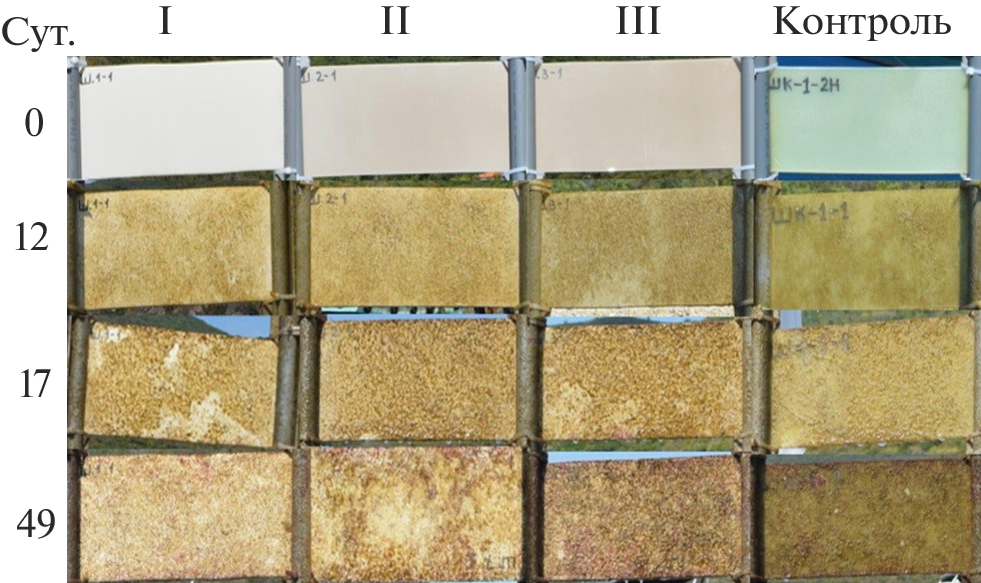 The results of a study of the resistance of protective coatings of three compositions to atmospheric corrosion in a humid tropical climate (SR Vietnam) are presented. The process of the biological fouling of coatings in the natural conditions of the South China Sea is studied. Coatings based on cycloaliphatic epoxy resin modified with epoxy rubber with fillers (mica-muscovite, TiO2) are chosen as the objects of research. To improve the anticorrosion and antifouling properties of the coatings, a triethanolamine complex with cobalt(II) cinnamate, which has a pronounced antimicrobial activity, is introduced into their composition.