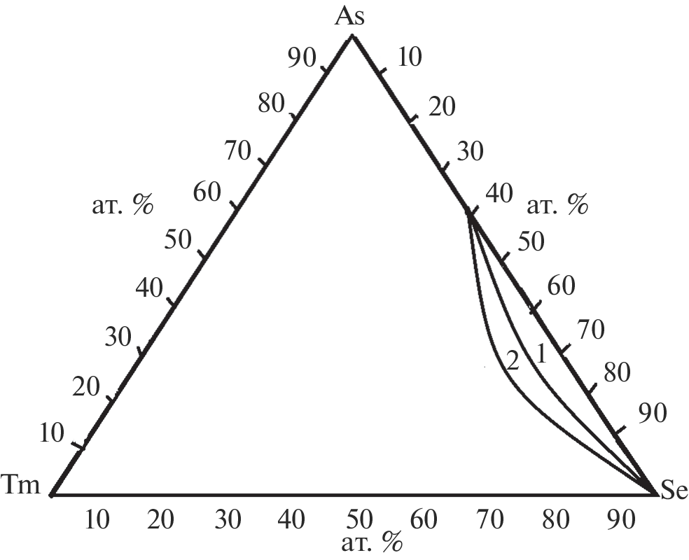 Based on the data obtained by complex methods of physicochemical analysis on studying various sections of ternary Tm–As–S(Se) systems and using the published data, the boundary of the glass formation region of the Tm–As–S and Tm–As–Se system is determined. It is established that at a cooling rate of 10 deg/min in the Tm–As–S system, the glass formation area of the system’s glass is 33 at % of the total area of the triangle; and at a cooling rate of 102 deg/min, 51 at % of the total area of the triangle. In the Tm–As–Se system under the specified cooling regimes, the glass area is 35 and 54 at %, respectively.