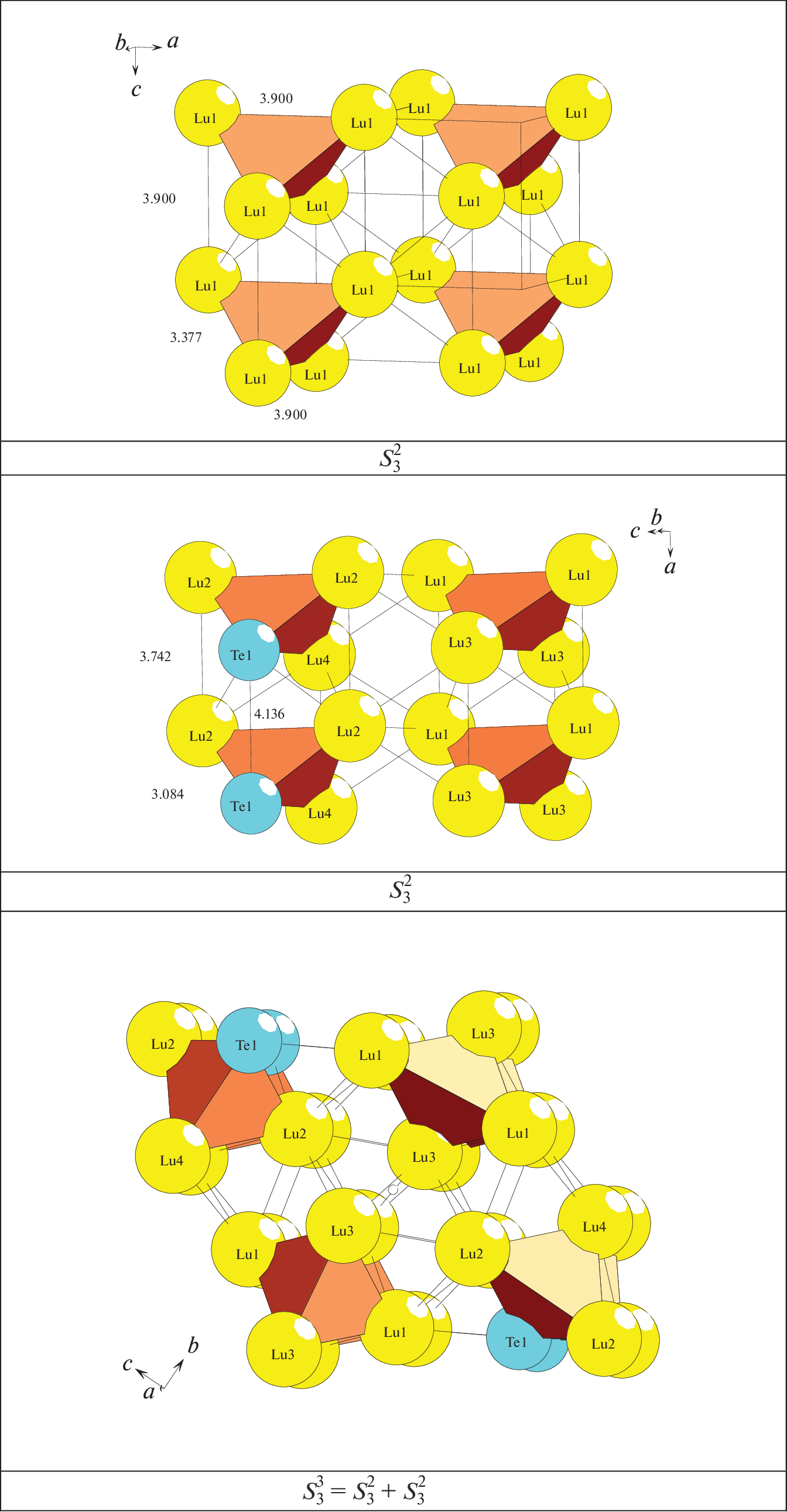 With the help of computer methods (ToposPro software package), a combinatorial topological analysis and modeling of the self-assembly of Lu4Te4-oF8 (Fm-3m, V = 211.0 Å3), Te4Lu28-oC32 (Cmcm, V = 908.3 Å3), Lu3(TeLu3)Lu2-hP9 (P-62m, V = 908.3 Å3), and Lu66Te24-mC90 (C12/m1, V = 2467.2 Å3) crystal structures are carried out. For the crystal structure of Lu4Te4-oF8, cluster precursors K8 = 0@Te4Lu4 with symmetry –43m; for Te4Lu28-oC32, tetrahedral cluster precursors K4 = 0@Lu4 and K4 = 0@TeLu3 with symmetry 2 and m; and for Lu3(TeLu3)Lu2, cluster precursors K7 = 0@Lu3(TeLu3) with symmetry 3m and spacers Lu are established. For the crystal structure of Lu66Te24-mC90, pyramid-shaped cluster precursors K5 = 0@Lu5 with symmetry 2, tetrahedra K4 = 0@Lu4 with symmetry 2, tetrahedra K4 = 0@TeLu3, and tetrahedra K4 = 0@Te2Lu2 are established, and rings K3 = 0@TeLu2 are involved in the formation of supraclusters-trimers. The symmetry and topological code of the processes of self-assembly of 3D structures from cluster precursors is reconstructed in the following form: primary chain → layer → framework.