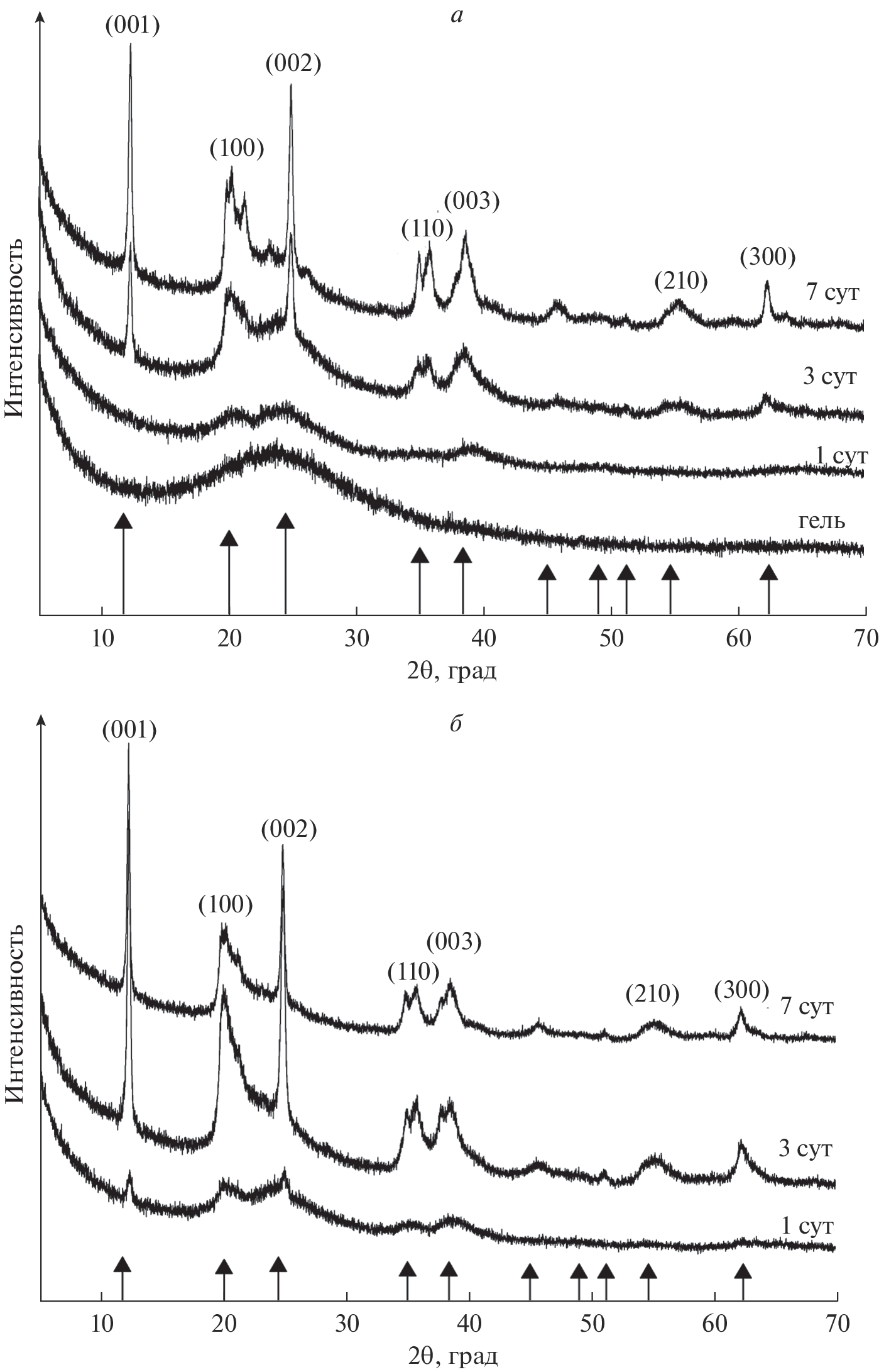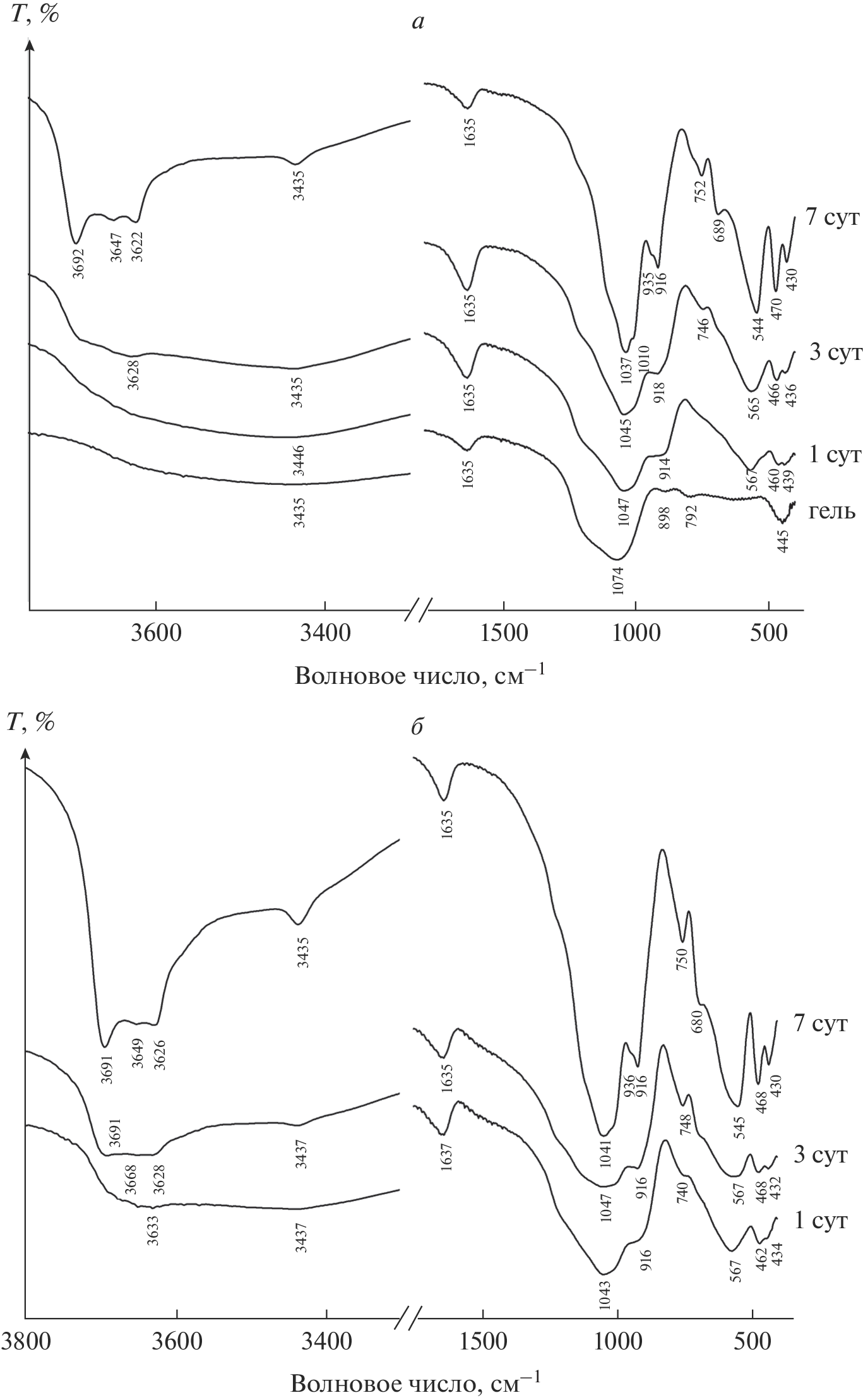 Проведен анализ данных рентгеновской дифракции и ИК-спектроскопии синтетических алюмосиликатов подгруппы каолинита с различной степенью кристалличности. Образцы были получены в гидротермальных условиях в щелочной и нейтральной средах с различной продолжительностью синтеза. Показано, что с увеличением времени синтеза наблюдается постепенный переход аморфной фазы в кристаллическую, что отражается на ИК-спектрах смещением полос, связанных с колебаниями групп в октаэдрических и тетраэдрических сетках. Первая полоса валентных колебаний гидроксильных групп при 3628 см–1 появляется через трое суток гидротермальной обработки в нейтральной среде, а в щелочных условиях при той же длительности обработки наблюдаются еще две полосы при 3687 и 3668 см–1. Обнаруженные изменения в ИК-спектрах соответствуют появлению характеристических рентгеновских отражений галлуазита по данным РФА. Таким образом, ИК-спектроскопия может быть рассмотрена как метод качественной оценки степени кристалличности.