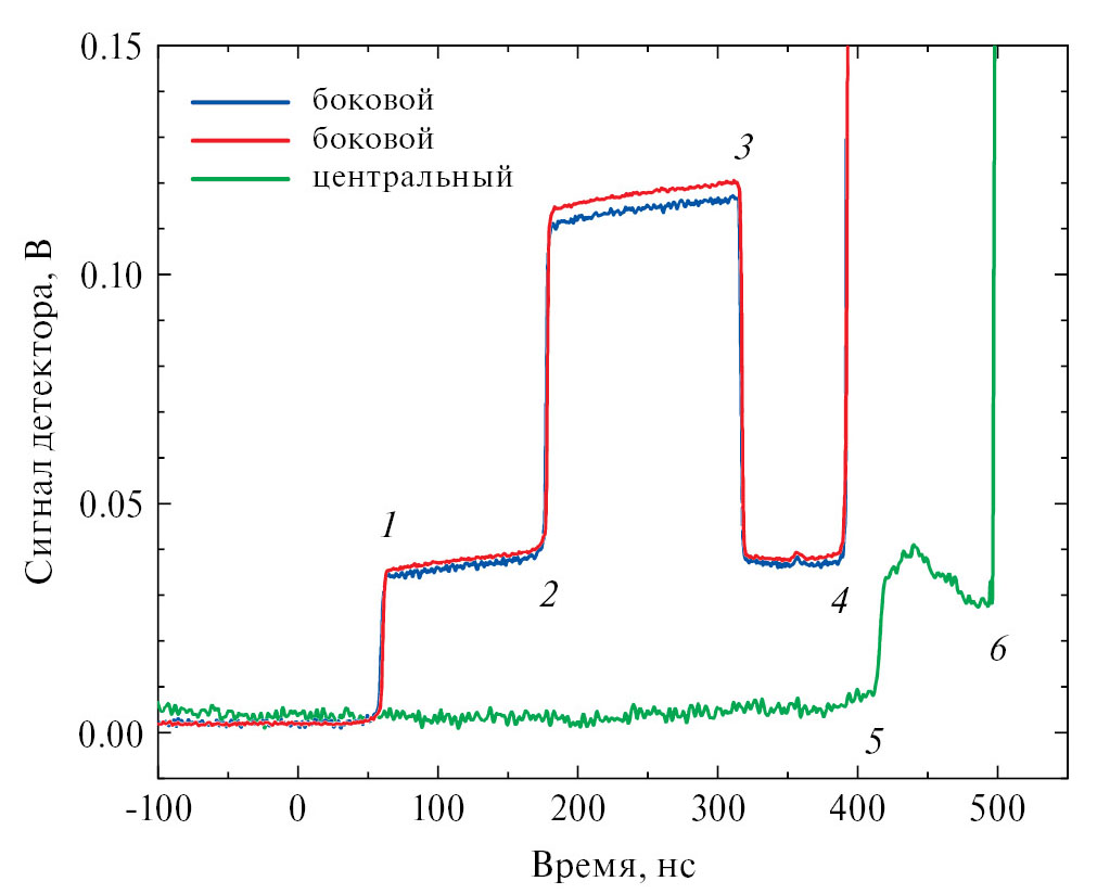 Для определения скоростей ударных волн в кварце и в образце использовалась оптическая базисная методика: скорости рассчитывались по времени прохождения ударной волны (УВ) по образцам известной толщины. Через окна на центр образца и на незакрытую образцом периферийную область кварца (на расстоянии +7 и ‒7 мм от центра) смотрели три оптоволоконных датчика, соединенных со скоростными фотодетекторами отрезками оптического волокна одинаковой длины, которые регистрировали собственное свечение ударных волн в кварце и в окнах из ПММА. Типичная регистрация фотодетекторов приведена на рис. 4. Видно, что два боковых детектора регистрируют моменты прохождения УВ через слои экрана (1–2), кварца (2–3) и окна (3–4). В момент (3) УВ входит в образец. Центральный детектор регистрирует моменты выхода УВ из образца (5) и прохождение ее по окну (5–6). Момент входа УВ в образец определялся как среднее арифметическое из точек (3). Данная методика позволяет определить скорость первой ударной волны и массовую скорость сжатого образца за пластической волной.