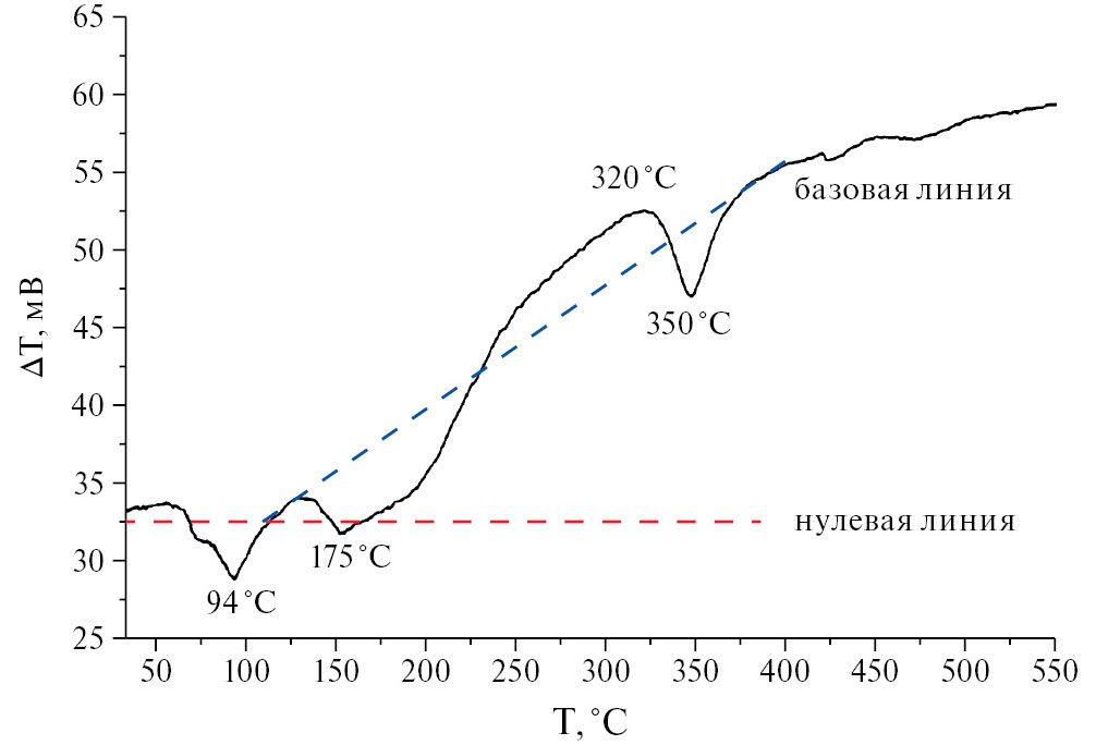 Рис. 1. Результаты дифференциально-термического анализа нанопорошка состава Gd0,4Sr0,1Co0,5O3, полученного методом совместной кристаллизации солей.