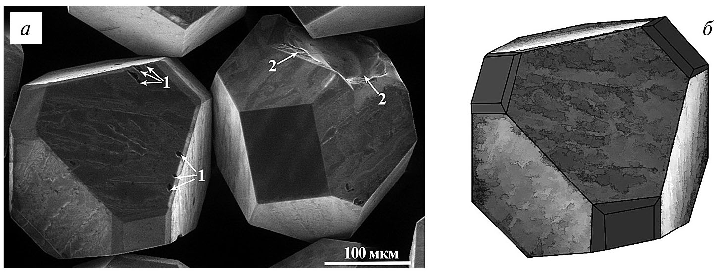Микрофотографии алмазного микропорошка марки АСМ и алмазного порошка марки АС160, полученные на SEM в обратно-рассеянных электронах (BSE), представлены на рис. 1. Частицы АСМ имеют осколочную форму (рис. 1а), в то время как АС160 имеют четкие грани (рис. 1б), представлены в виде частиц кубооктаэдра (рис. 2а) и усеченного октаэдра (рис. 2б). Наиболее развитыми гранями алмазов АС160 являются октаэдрические {111} и кубические {100} (рис. 2). На исходных (неграфитизированных) частицах алмаза присутствуют поверхностные дефекты (рис. 3): ямки травления металла, сколы (рис. 3а) и ступеньки роста кристалла (рис. 3б). Причем большинство дефектов (ямок травления и сколов) образуется на гранях {111} алмаза. Зарождение и рост кристалла алмаза происходит с менее дефектной грани (100), ступенчато, по направлению к центру кристалла, параллельно каждой грани (100). Такой механизм роста кристаллов алмаза связан с разной скоростью роста: быстрой (грани {100}) и медленной (грани {111}), что в дальнейшем будет определять разную скорость графитизации граней алмаза.