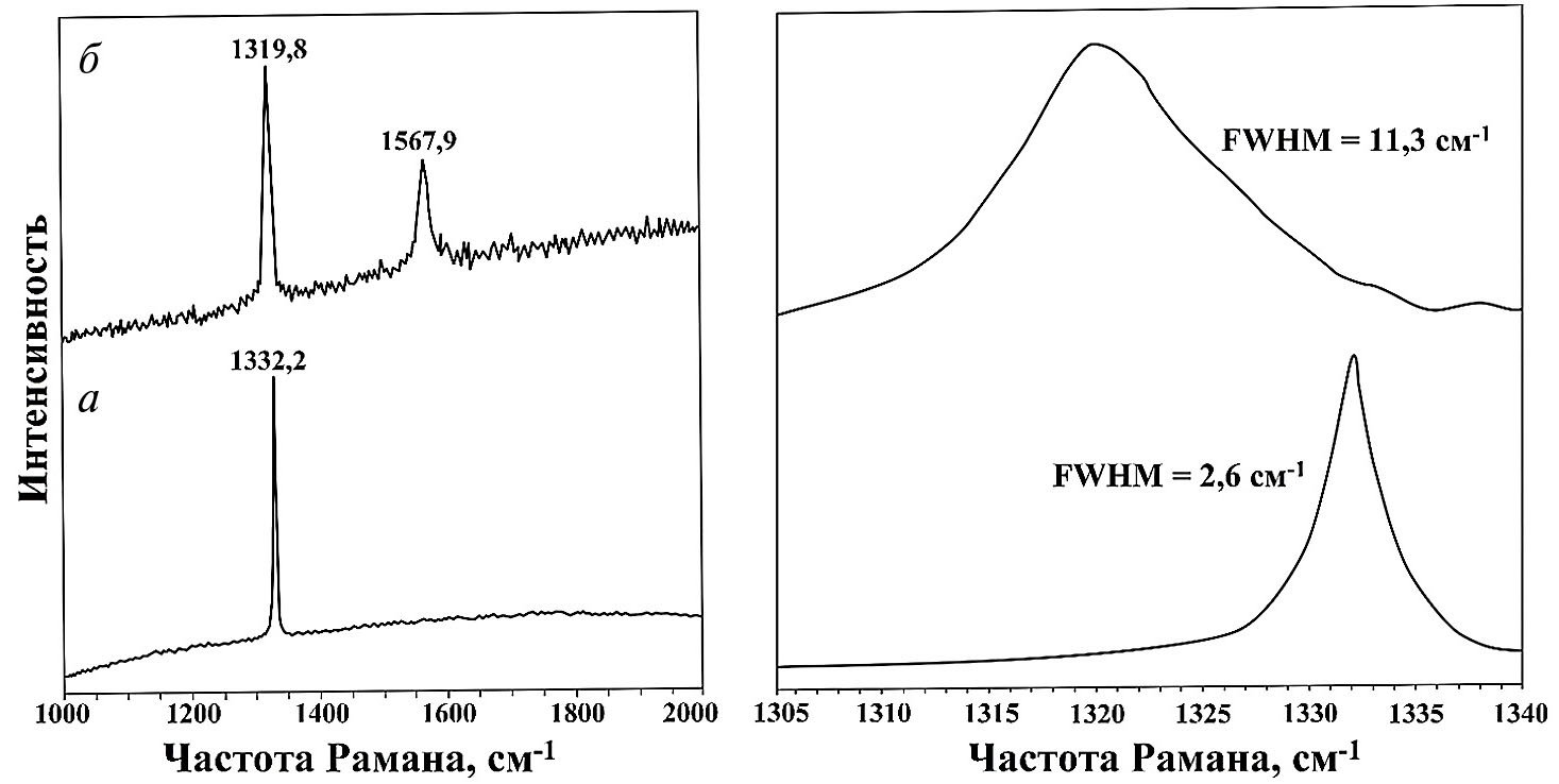 Методом спектроскопии комбинированного рассеяния получены рамановские спектры алмазных порошков (рис. 5). Спектр алмазного порошка АС160 характеризуется острым пиком высокой интенсивности с максимумом при значении 1332,2 см–1 (рис. 5а, слева), ширина пика на половине максимума интенсивности (FWHM) — 2,6 см–1 (рис. 5а, справа). Этот пик соответствует линии комбинационного рассеяния первого порядка — решетка с sp3-связями кристалла алмаза [40]. Уменьшение размера алмазных частиц и, следовательно, увеличение площади поверхности приводит к смещению пиков спектра Рамана в сторону более низких волновых чисел [41]. При анализе микропорошка АСМ видно, что пик алмаза смещается в область более низких значений 1319,8 см‑1 (рис. 5б, слева), а FWHM равен 11,3 см–1 (рис. 5б, справа), что объясняется слабой кристалличностью и наличием небольших примесей графита. Присутствие графита в алмазном порошке АСМ подтверждается наличием пика спектра Рамана при значении 1567,9 см–1 (рис. 5б, слева). Данный пик соответствует линии комбинационного рассеяния sp2-гибридизированных атомов углерода [42, 43]. Невысокая интенсивность графитового пика говорит о его малом содержании, не воспринимаемом рентгенофазовым анализом (рис. 4б).