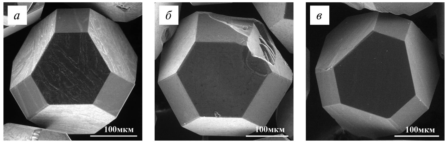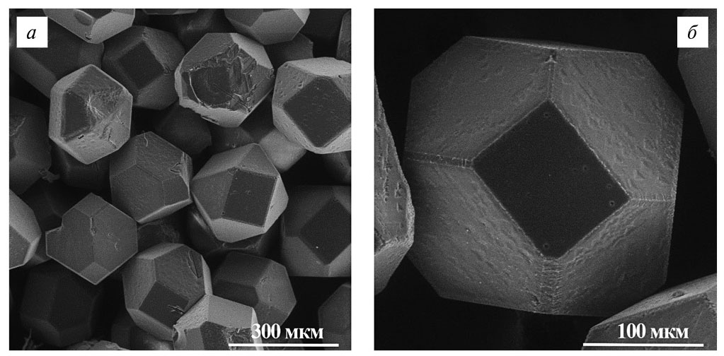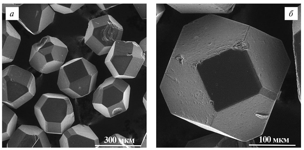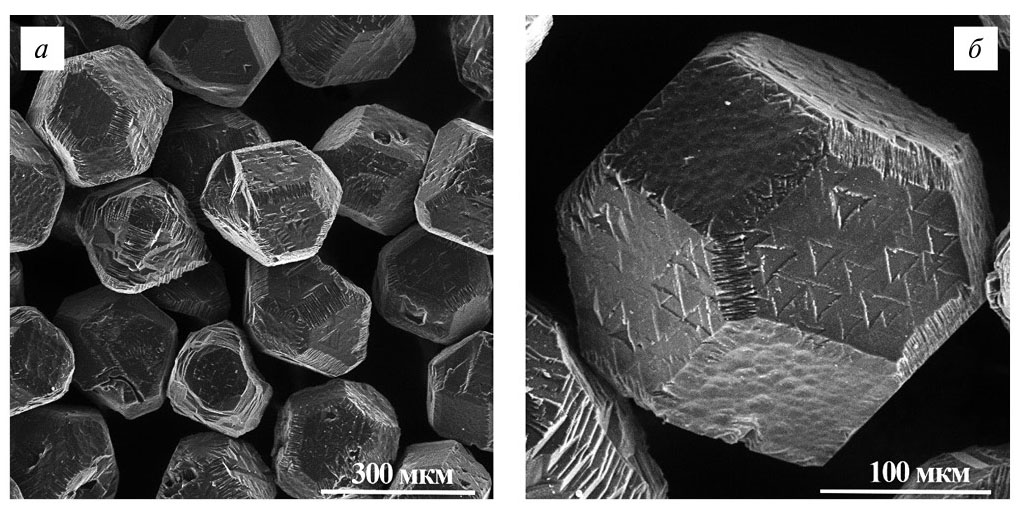 Рис. 2. Микрофотографии SEM исходных частиц алмаза, имеющих форму кубооктаэдра (а) и усеченного октаэдра, с наиболее развитыми кубическими {100} и октаэдрическими {111} гранями