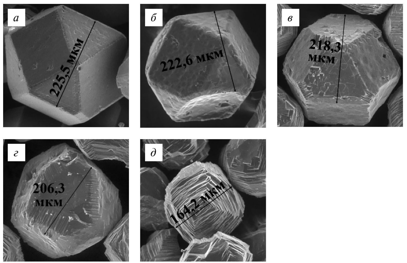 Рассчитанные значения потерь массы при температурах 600 и 700°C не являются достоверными величинами, поскольку измеренные размеры частиц 225,5 и 222,6 мкм находятся в области погрешности исходного размера алмазных частиц 226±4 мкм. При температуре 1000°C алмазные частицы претерпевают существенное разрушение, потеря массы — 27,35±1,32%. Для анализа выбраны бездефектные алмазные частицы, имеющие форму кубооктаэдра. Дефектные частицы (например, марки АСМ) разрушаются более значительно, и анализ потери массы данным способом затруднен.