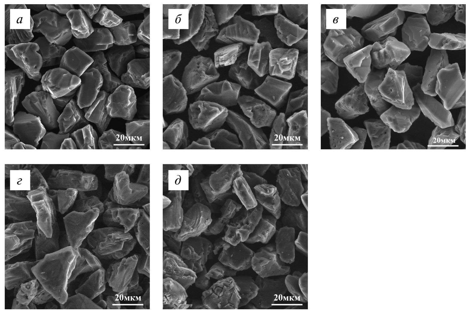 Рис. 17. Микроструктуры алмазных частиц микропорошков АСМ, термообработанных на воздухе при температурах: 600°C (а); 700°C (б); 800°C (в); 900°C (г); 1000°C (д)