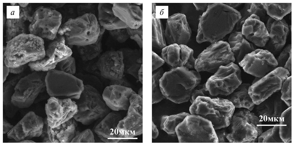 Рис. 21. Микроструктуры алмазных частиц микропорошка АСМ, термообработанного в вакууме при температурах: 1500°C (а) и 1600°C (б)