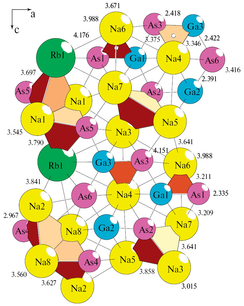 Кристаллические структуры RbNa8Ga3P6-oP72 и RbNa8Ga3As6-oP72 входят в кристаллохимическую группу четверных соединений AnBnCnDn с пространственной группой Pnma и 72 атомами в ромбической ячейке [4–11]. Последовательность Вайкоффа для 18 кристаллографически независимых атомов имеет вид c18. Параметры ромбической ячейки: a = 22.843, b = 4.789 Å, c = 16.861 Å, V = 1844.6 Å3. В частных с-позициях в плоскостях m (010) на высоте 0.25 и 0.75 находится по 36 атомов, связанных элементом симметрии g = –1. Значения координационных чисел для атома Rb — 17 атомов, атомов Na — 12 (2 атома), 15 (5 атомов), 17 (1 атом) и атомов Ga и As — по 9 атомов. Тип каркас-образующих кластеров-прекурсоров этой группы соединений, включающих топологически различные четверные соединений AnBnCnDn, неизвестен.