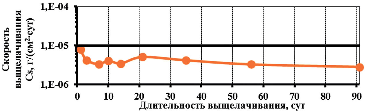 Исследование выщелачивания натрия и бора показывают, что по своей подвижности они близки друг к другу. Наиболее устойчиво в боросиликатных матрицах закреплен редкоземельный элемент — неодим. Так, скорость выщелачивания неодима из стекол уже на первые сутки составляет 1.8∙10–7 г/(см2∙сут), что на один порядок ниже показателей выщелачивания остальных элементов.