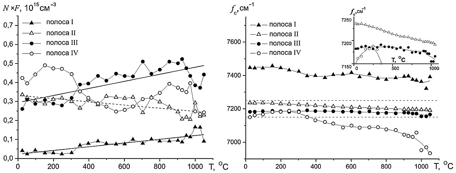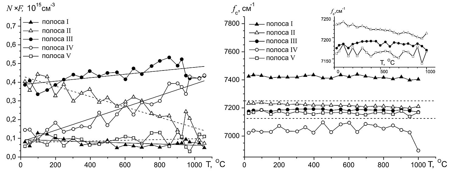 Ключевой особенностью, четко прослеживаемой на рис. 5, является немонотонная зависимость параметров полосы IV от температуры. В частности, до температуры 550°С произведение силы осциллятора на концентрацию активных центров для данной полосы испытывает монотонный спад, который сменяется на монотонный рост при более высоких температурах. Похожим образом изменяется и резонансная длина волны указанной компоненты. Отметим, что шумы параметров указанной полосы относительно невелики, что видно из рис. 5.