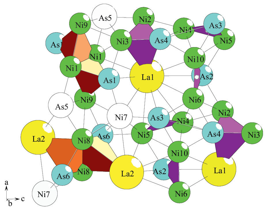 Тройное соединение La8Ni40As24–oP72 не имеет кристаллохимических аналогов. Параметры ромбической ячейки: a = 11.179 Å, b = 3.913 Å, c = 24.443 Å, V= 1069.3 Å3. Набор элементов точечной симметрии для пространственной группы Pnma: –1(4a, 4b), m(4c). Последовательность Вайкоффа для 18 кристаллографически независимых атомов имеет вид c18. Рассчитанные значения координационных чисел атомов La = 19 (1 атом) и 17 (1 атом), Ni = 12 (9 атомов), 13 (1 атом), As = 9 (5 атомов) и 1(1 атом). Тип каркас-образующих кластеров-прекурсоров, образующих упаковки не известен.