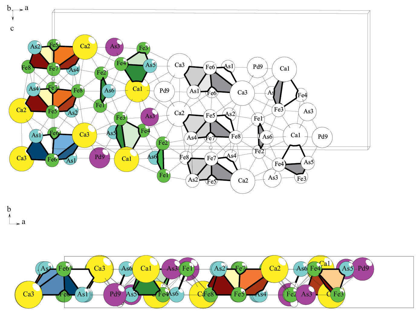 Рис. 3. Ca12Fe32Pd4As24-oP72. Слой S32 кристаллической структуры (две проекции)