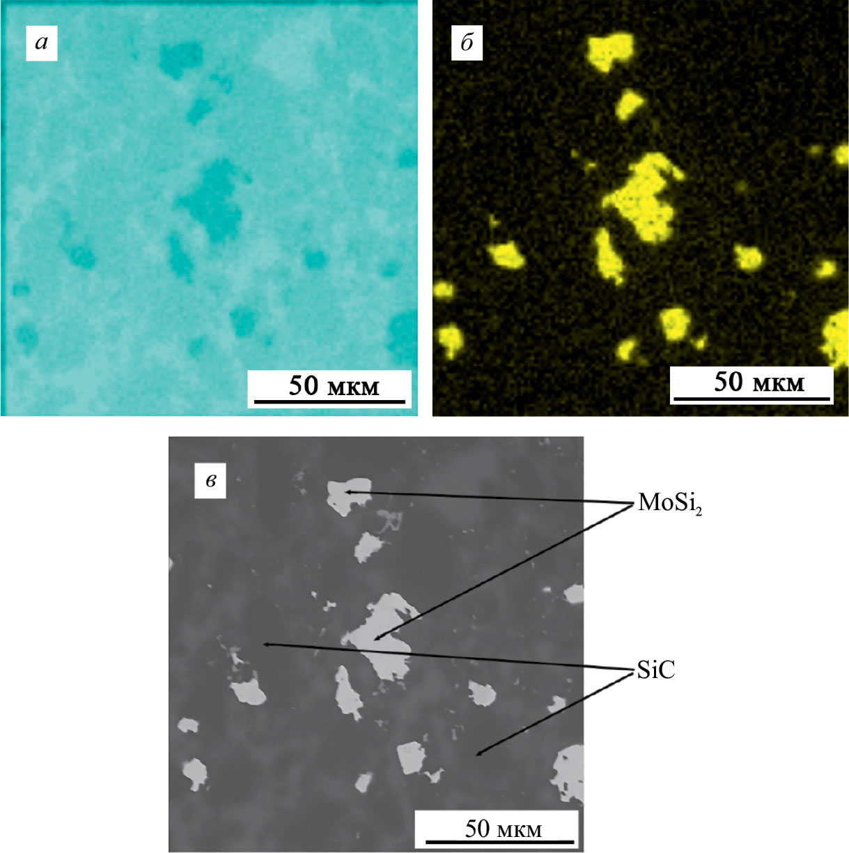 Соединения молибдена, в частности дисилицид молибдена, часто применяется в связке с карбидом кремния для получения композита с более высоким уровнем жаропрочности [10–15]. В качестве примера, композит SiC–MoSi2 был получен в работе [16] из механической смеси порошков Mo, Si и С. В ходе постепенного нагрева компактированных образцов, при 1100°C определили фазы Mo и Si, вместе с небольшим содержанием Mo3Si и Mo5Si3. При 1300°C основными зафиксированными фазами были SiC–MoSi2, затем образцы спекали при 1550°C. Предел прочности при изгибе полученных образцов составил 275 МПа.