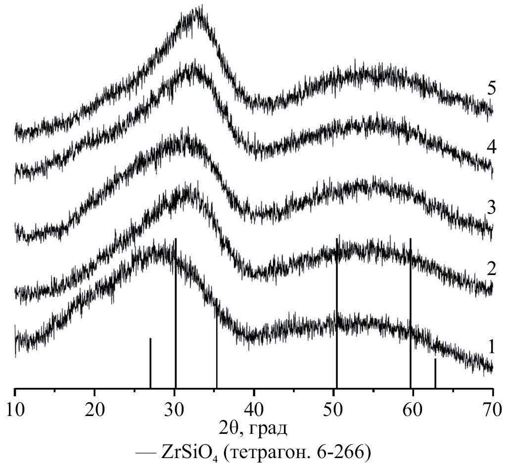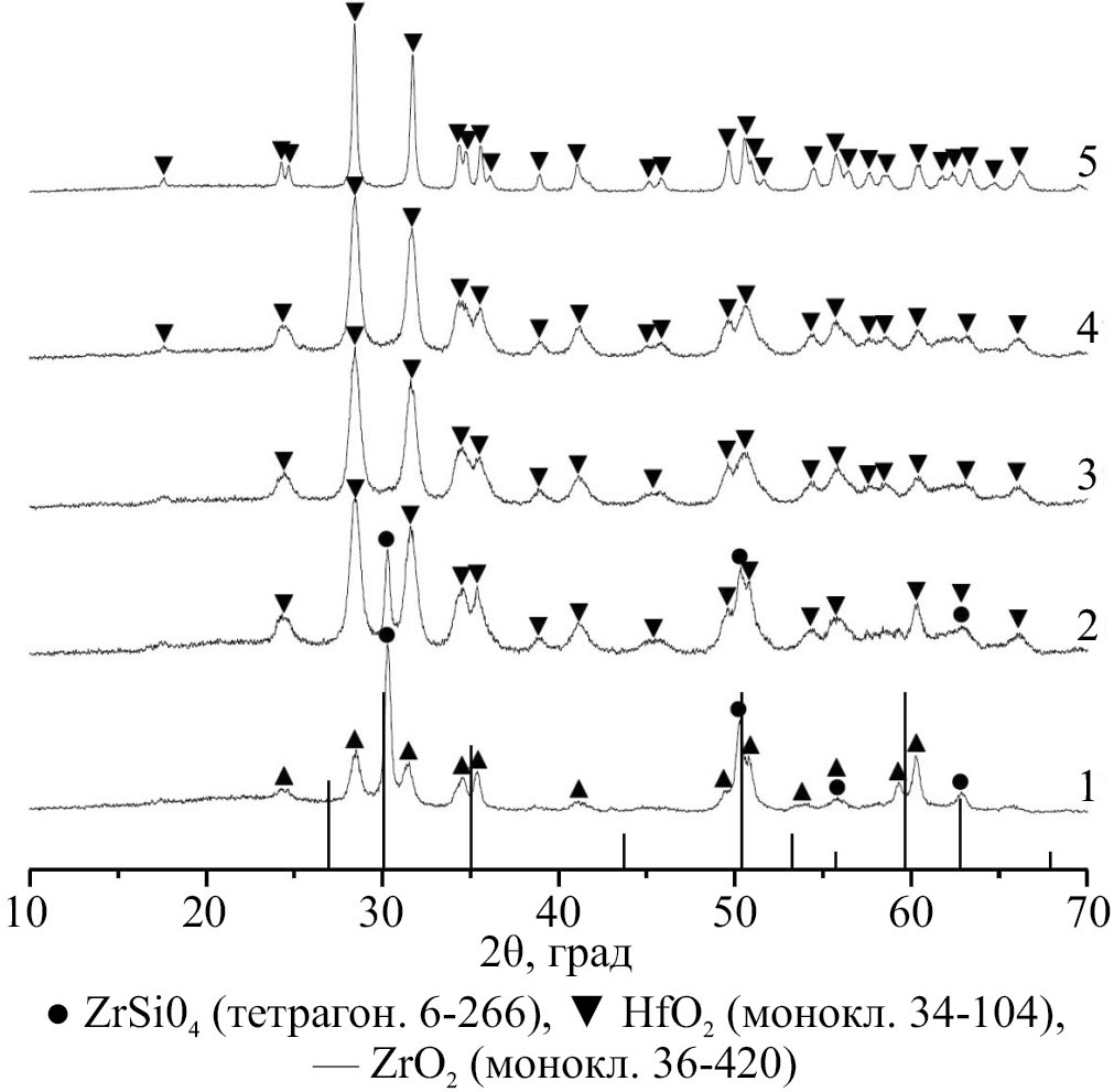 Рентгеновские дифрактограммы, представленные на рис. 4, подтверждают образование соответствующих композиций (1–x)ZrSiO4–xHfO2, при этом заметно стимулирующее влияние оксида гафния, как и в случае оксида циркония [7], на кристаллизацию циркона в смеси компонентов – рефлексы, отвечающие циркону, становятся более узкими и интенсивными (рис. 4, дифрактограммы 2–4). Это подтверждается и снижением температуры начала кристаллизации циркона в композициях (рис. 3).